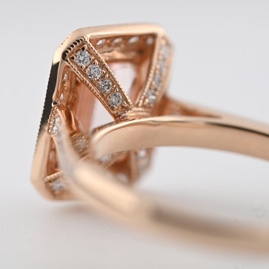 Beards 18k Rose Gold Emerald Cut Morganite & Diamond Halo Ri