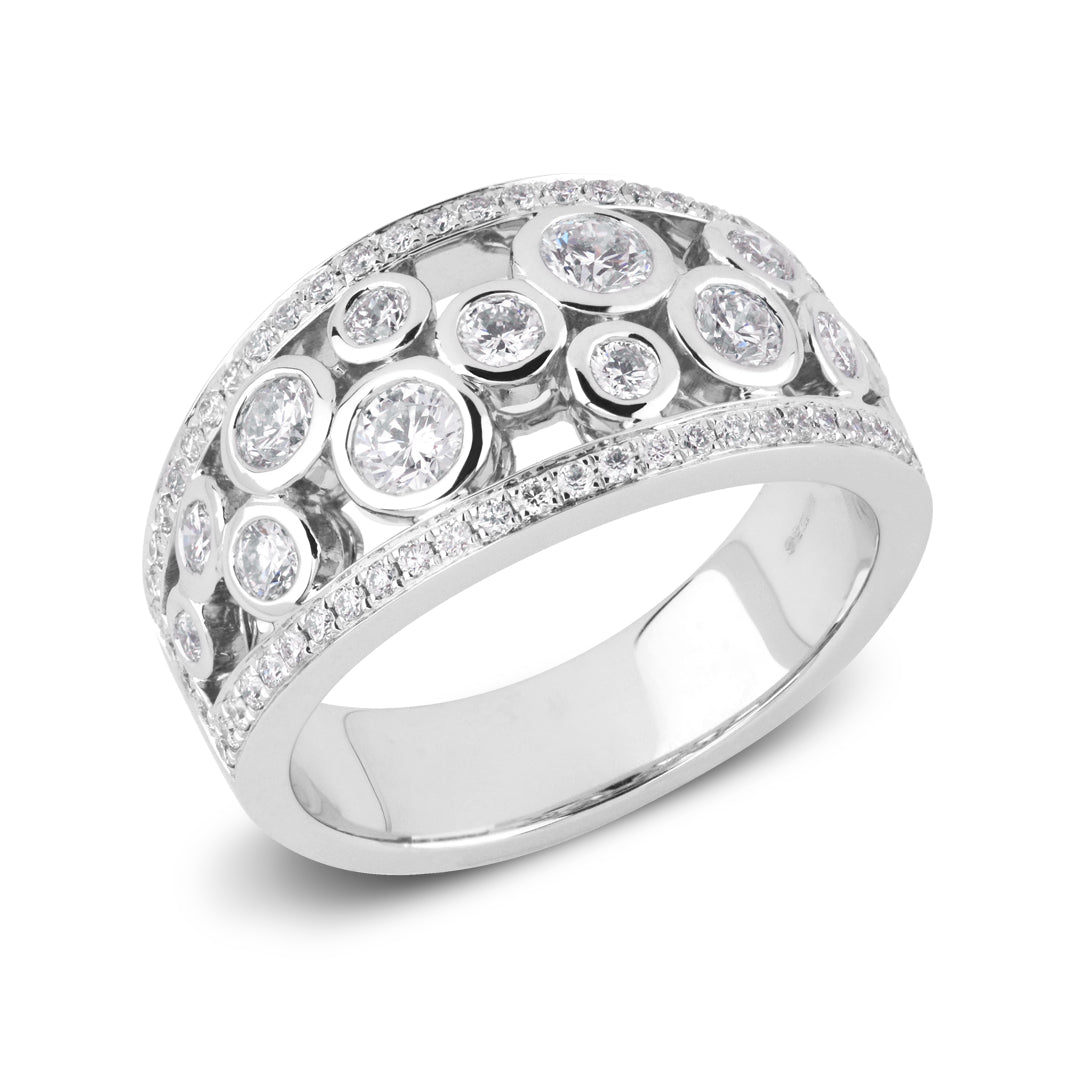 Playful and sophisticated, this bubble ring features round brilliant cut diamonds rub set in 18k white gold. To further accent the round stones, there are two channels of smaller diamonds on each side framing the centre diamonds.