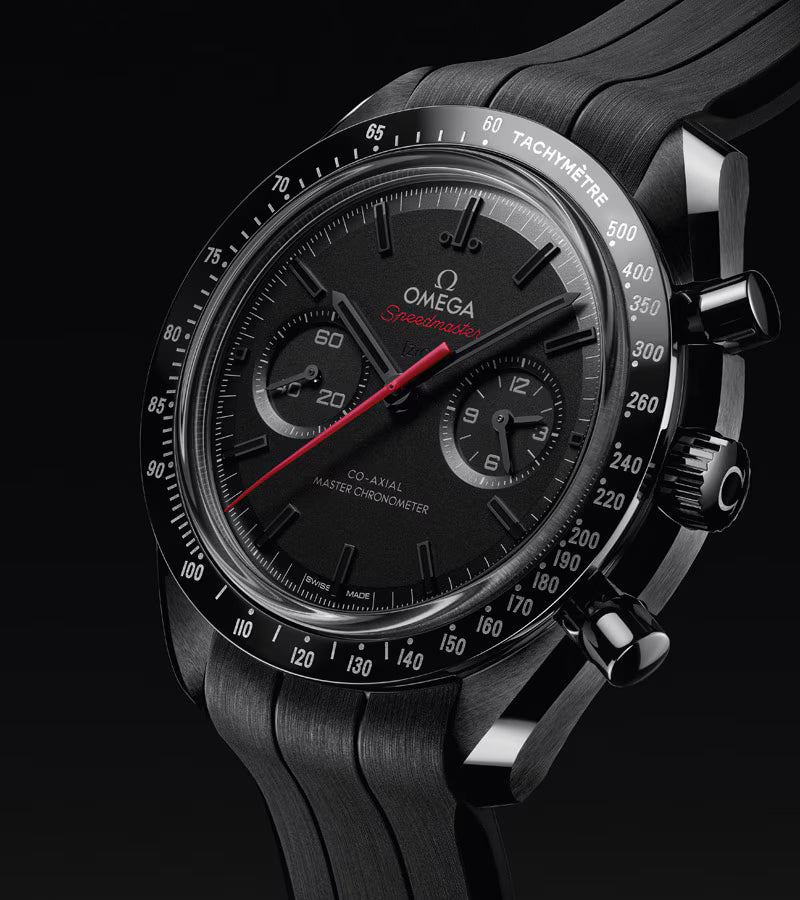 One of the most striking evolutions in the collection is the version distinguished by its vivid red central seconds hand. This detail, paired with the matching red “Speedmaster” text on the dial, injects a sense of energy into the otherwise shadowed aesthetic of the Dark Side series.