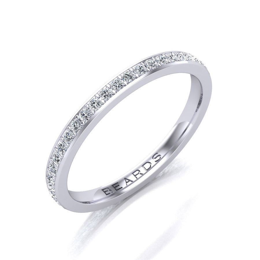 Sparkling round brilliant cut diamonds span this platinum eternity ring. Designed and crafted in-house at our jewellery workshop in Cheltenham by our master goldsmith and gemstone setter. Eternity rings are the perfect symbol of eternal love and commitment.