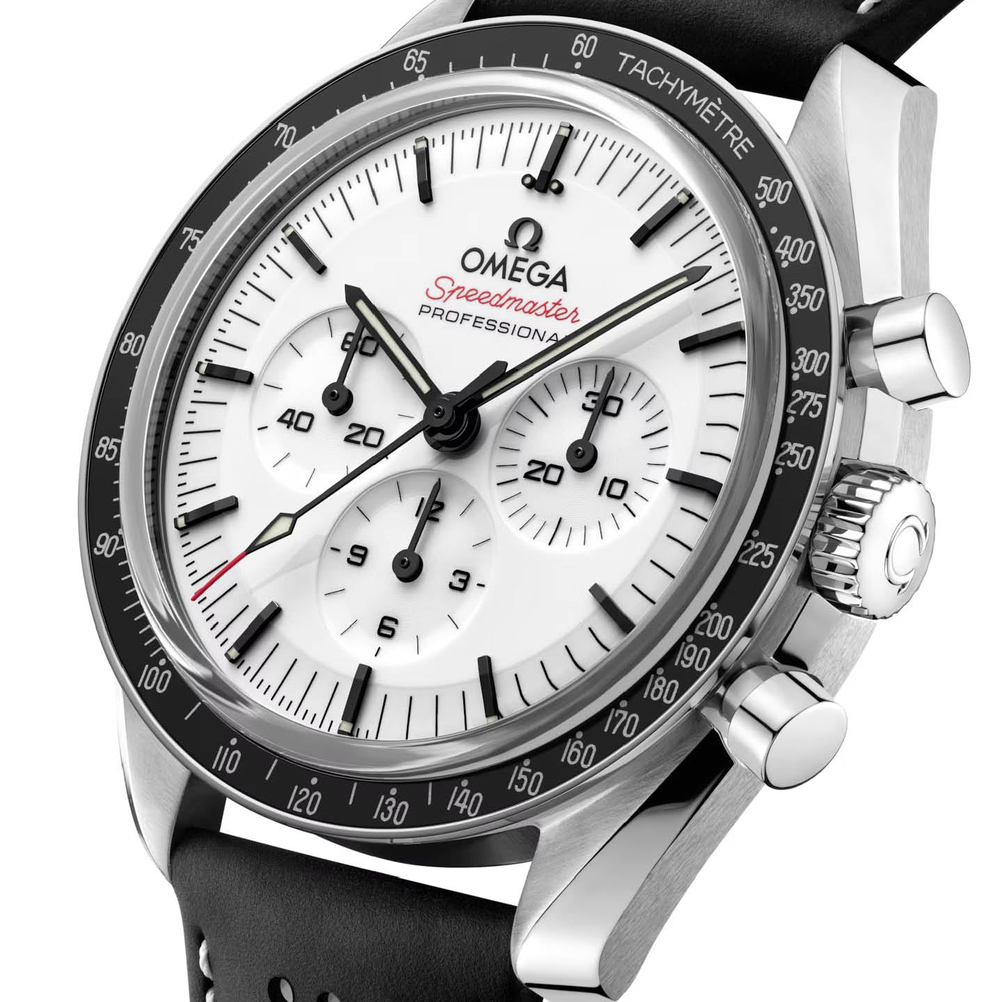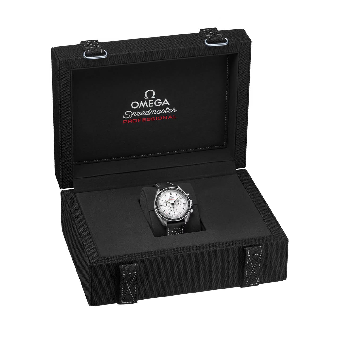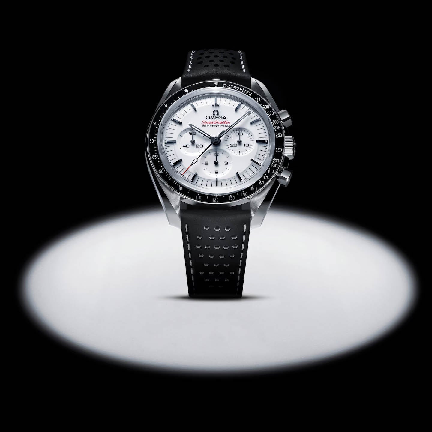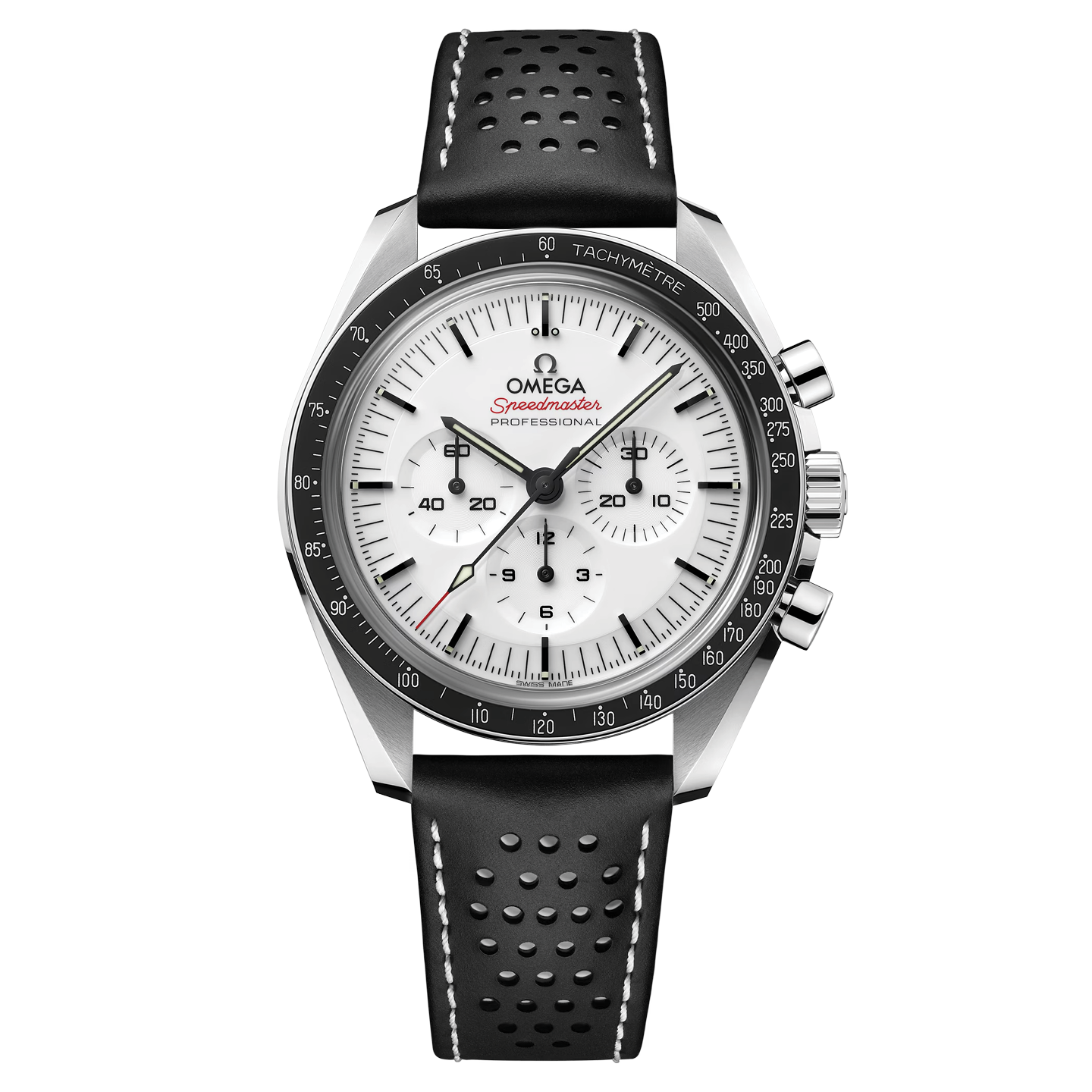 This 42 mm stainless steel model is presented on a black micro-perforated leather strap with red and white stitching, giving the watch a sporty yet refined character. It features sapphire crystal glass on both the front and caseback, allowing a full view of the craftsmanship inside and out. The design draws inspiration from the fourth generation Speedmaster worn on the moon, complete with an asymmetrical case, white lacquered step dial, applied Omega logo, Moonwatch-style hands, and the historic “dot over 90” on the black anodised aluminium bezel.