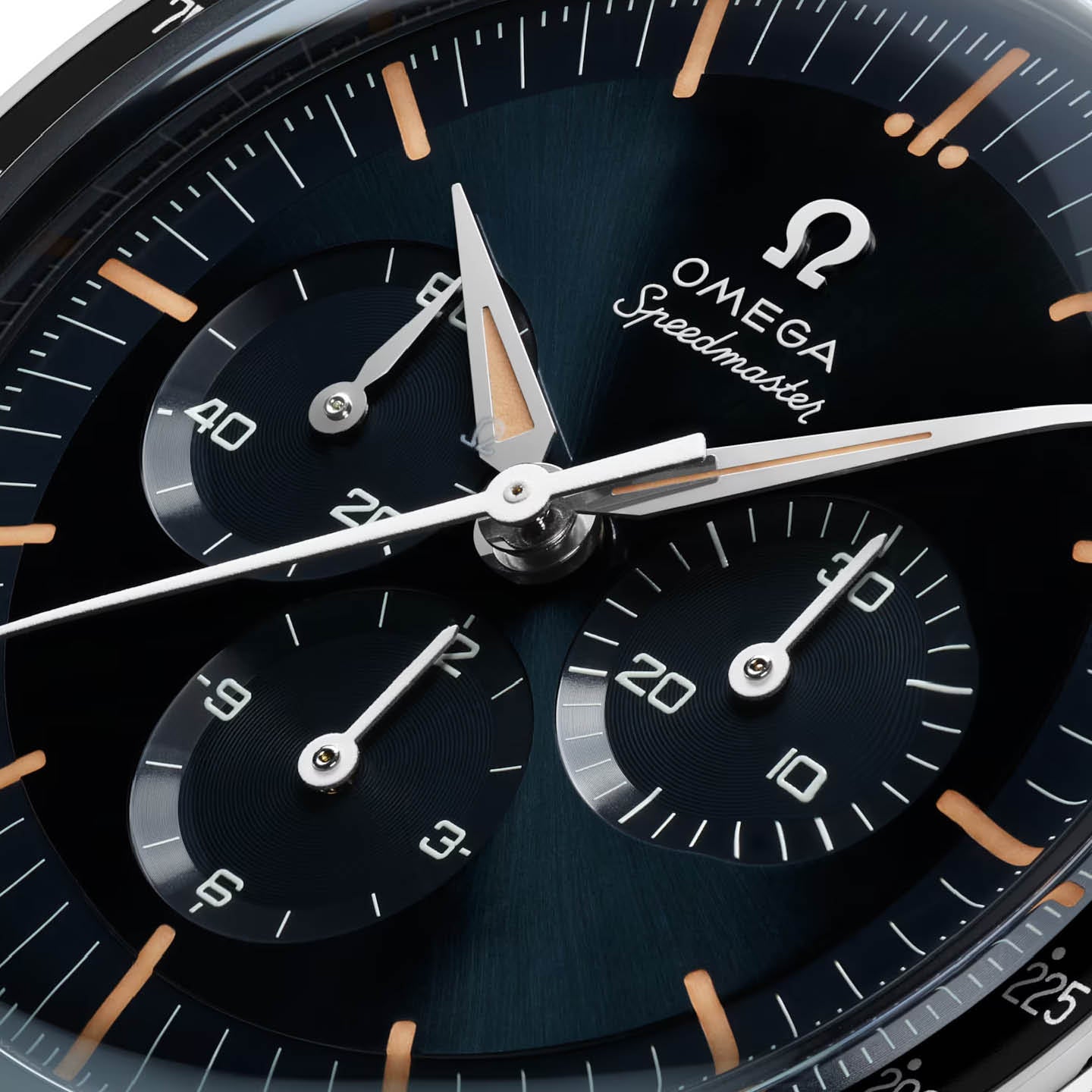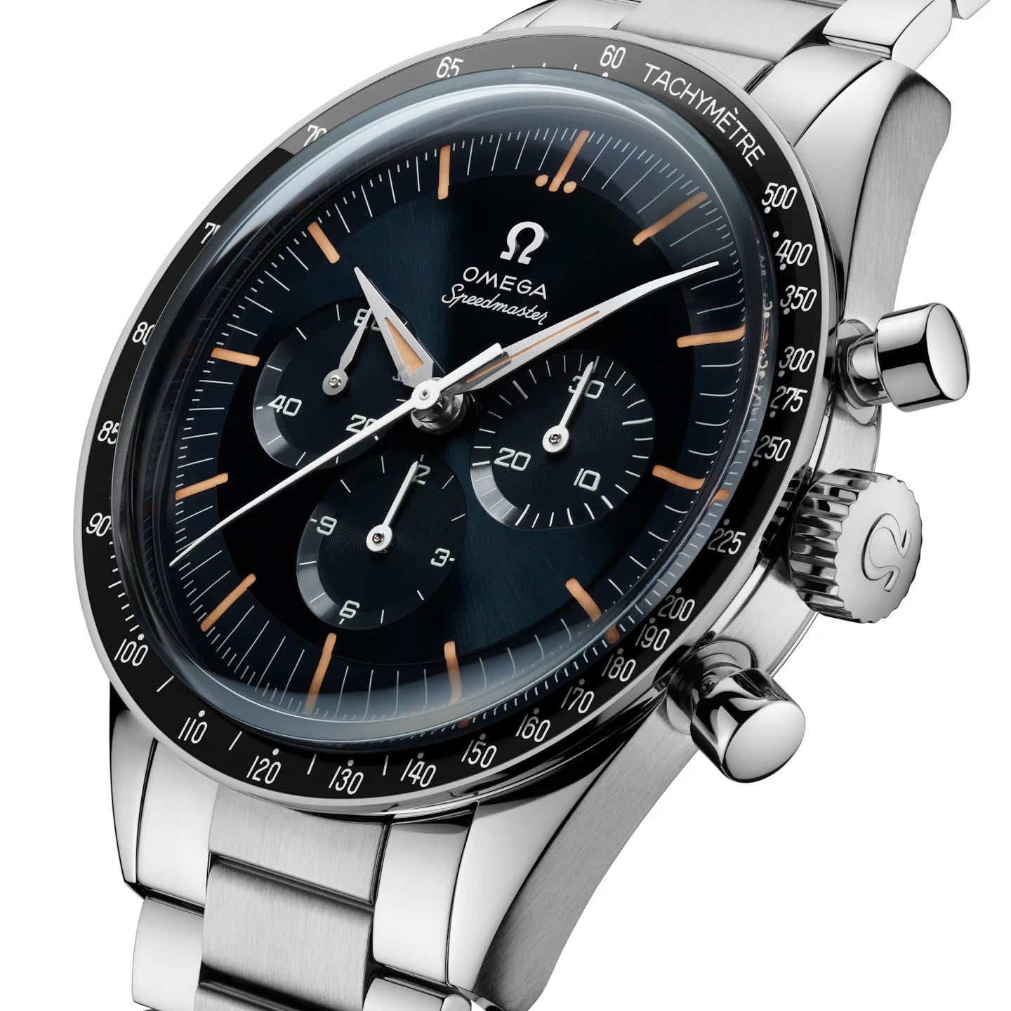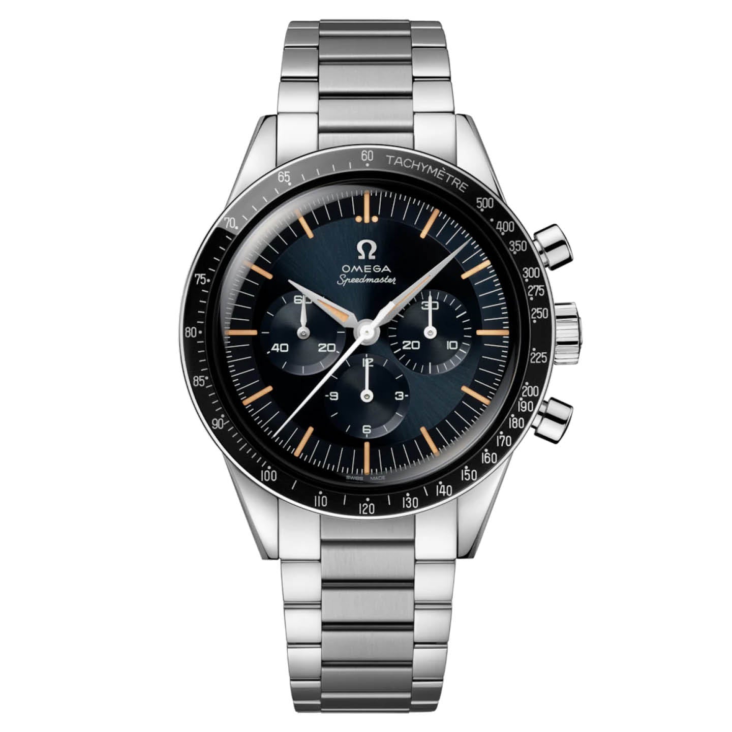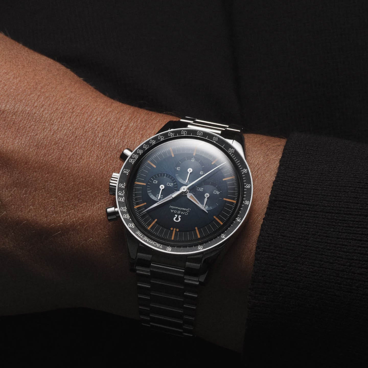 The 39.7 mm stainless steel case is finished with a mix of polished and brushed surfaces and is paired with a flat-link bracelet that includes Omega’s patented comfort release adjustment system. Surrounding the dial, a black aluminium bezel holds the famous tachymeter scale with the collector-loved “dot over ninety” detail.