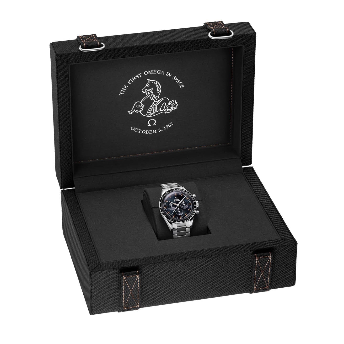 A vintage Omega logo appears on both the crown and dial, while the caseback displays the Seahorse medallion and engravings: “The First Omega in Space” and “October 3, 1962.”