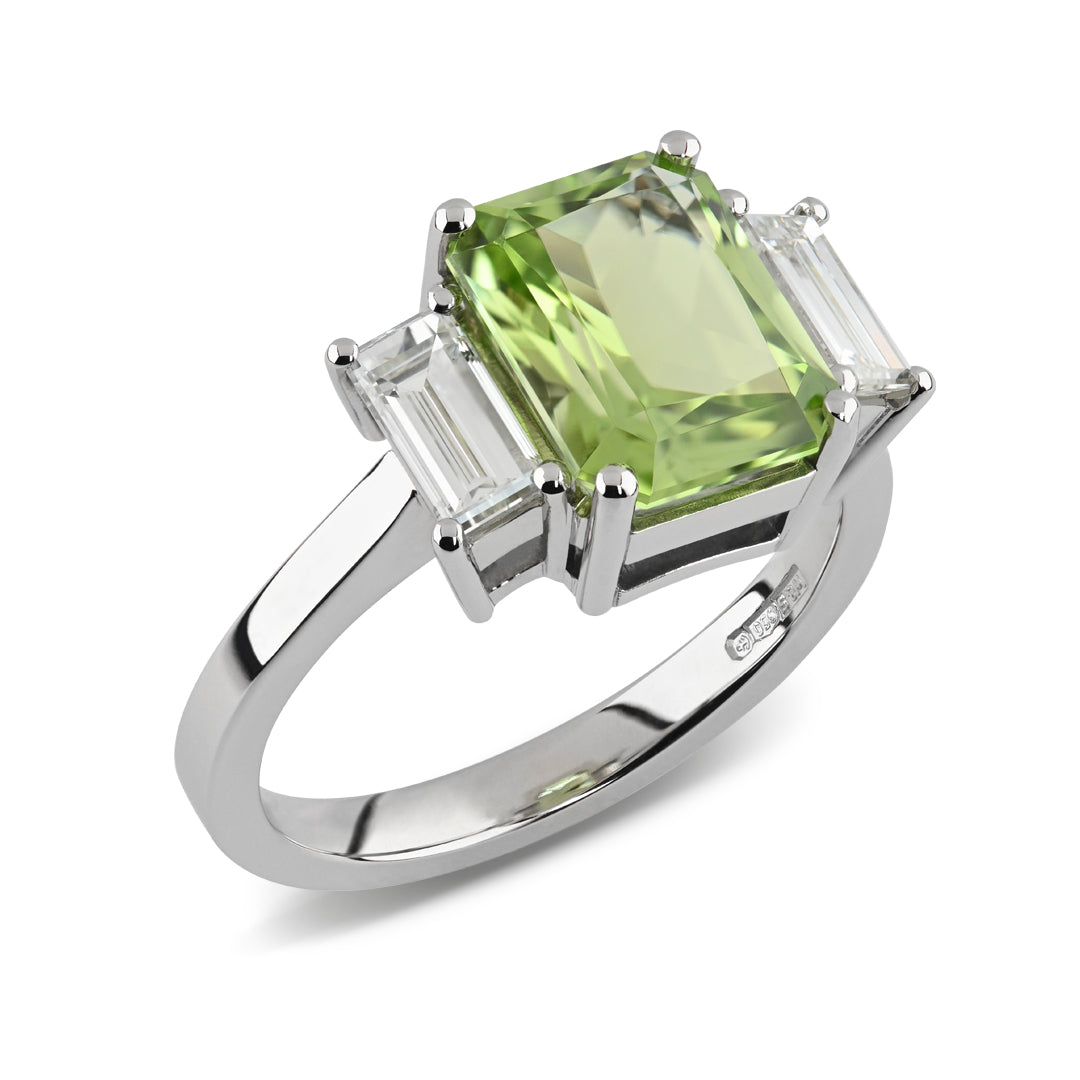 Set in lustrous platinum, this exquisite ring features a 3.36ct radiant cut peridot in the beautiful lime colour at its centre. Flanking the vibrant gem are two dazzling 0.88ct baguette cut diamonds, VS clarity and F colour.