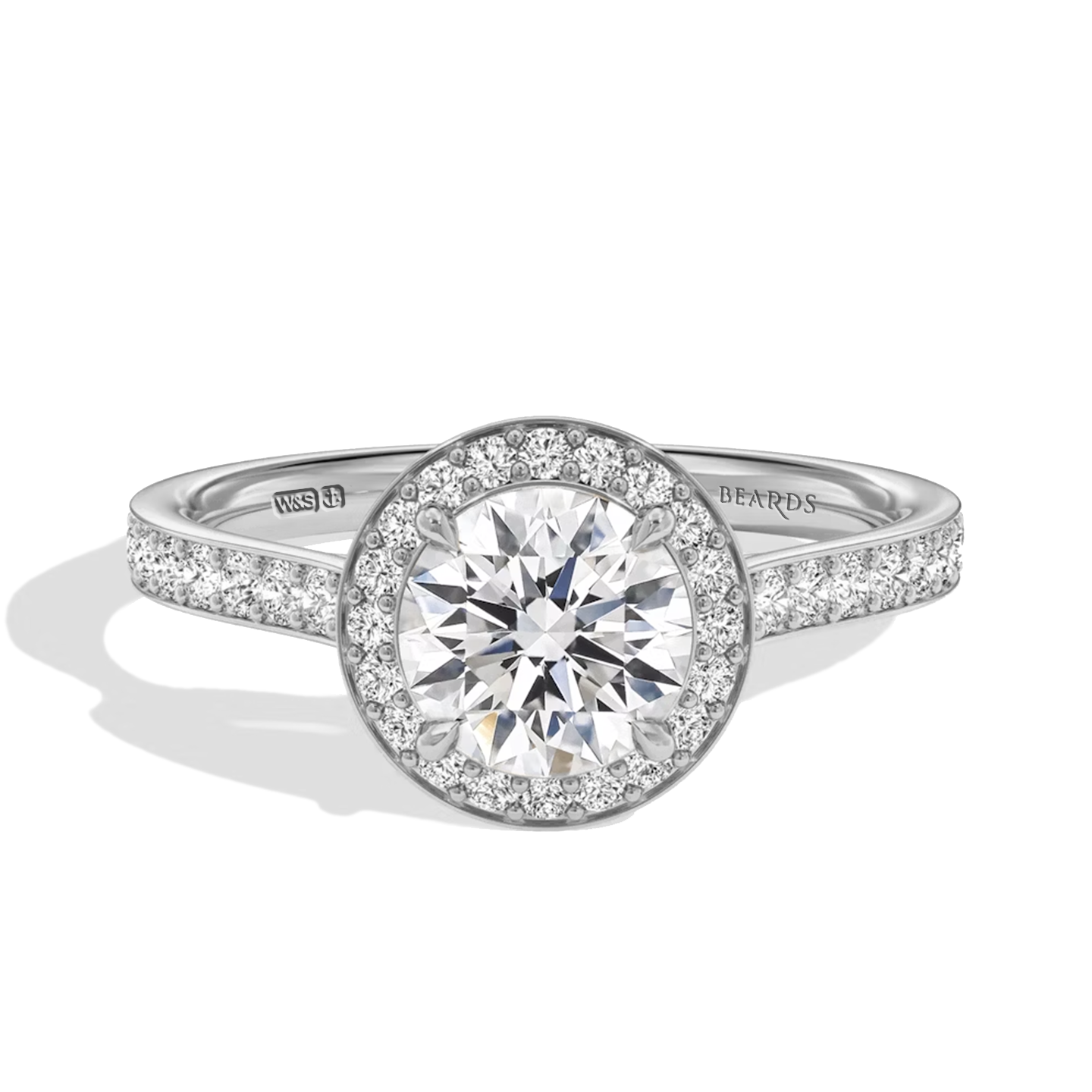 With its perfect symmetry and unrivalled sparkle, the round cut engagement ring remains a timeless symbol of romance. Encircled by a halo of finely set round diamonds, the central stone is magnified in brilliance and presence, radiating light with every movement. Diamond-set shoulders lead the eye elegantly towards the centre, adding even more luminosity without detracting from its balance and grace. This combination of halo and shoulder detailing creates a design that feels both luxurious and enduring, chosen by those who desire classic elegance with captivating sparkle. Refined, glamorous, and beautifully timeless, it is an engagement ring made to be treasured for a lifetime.