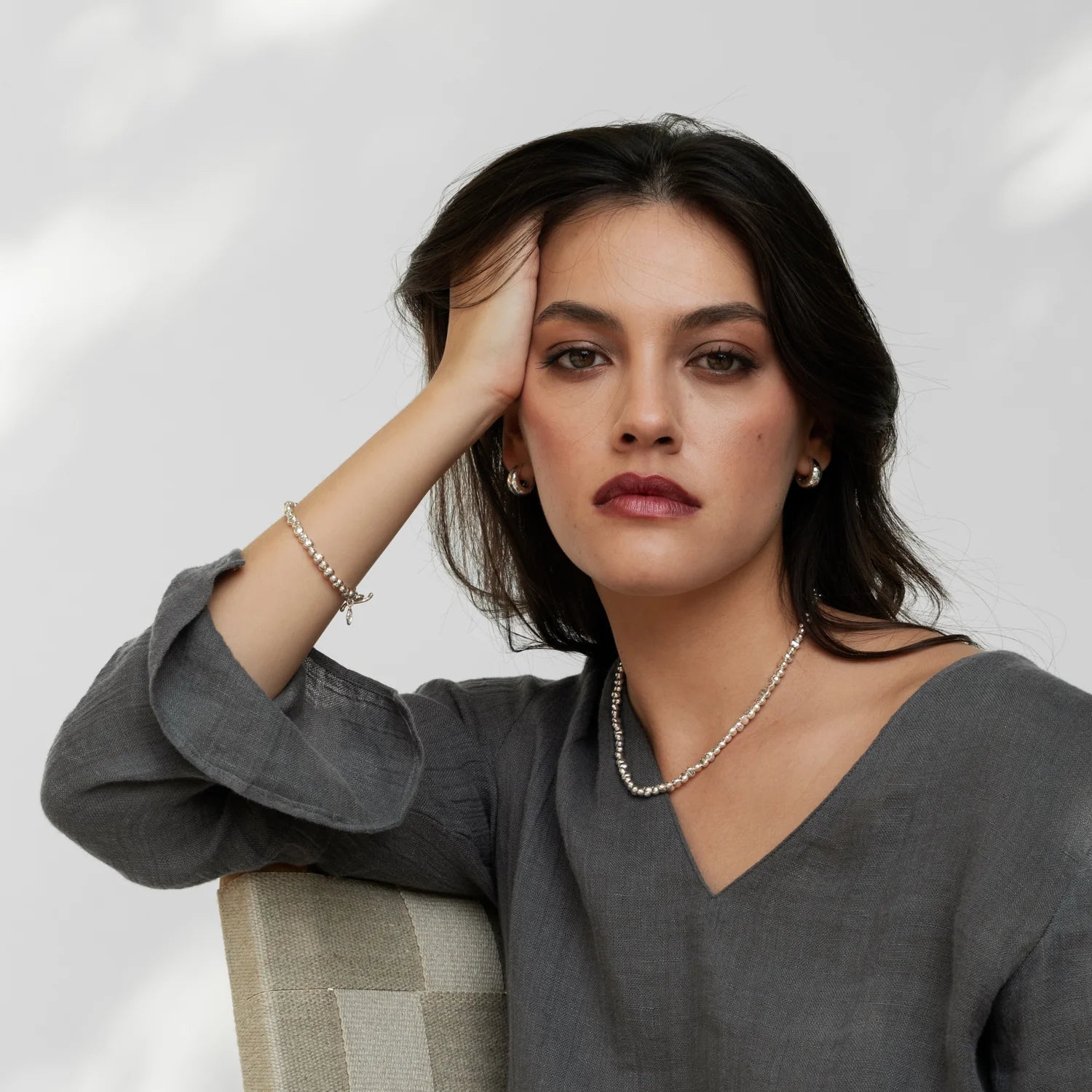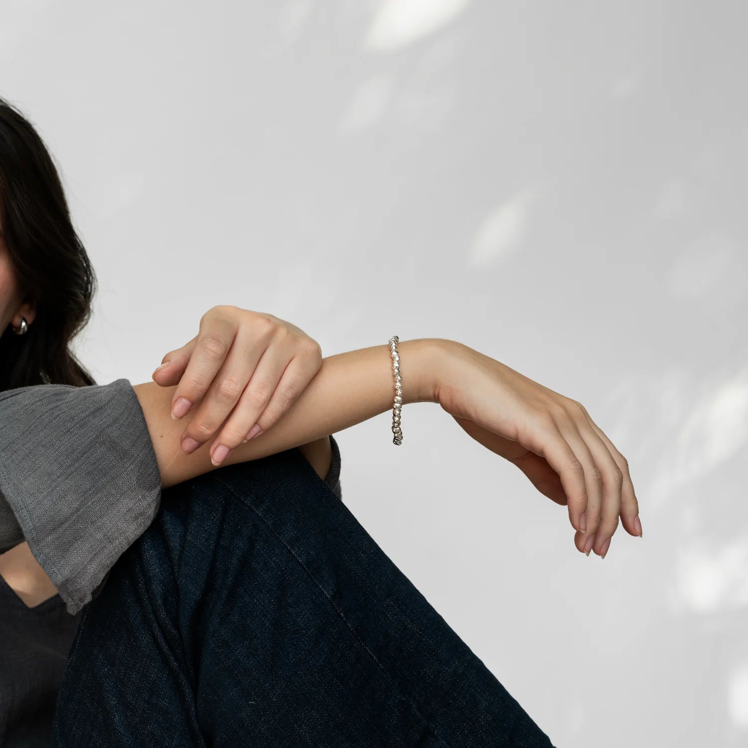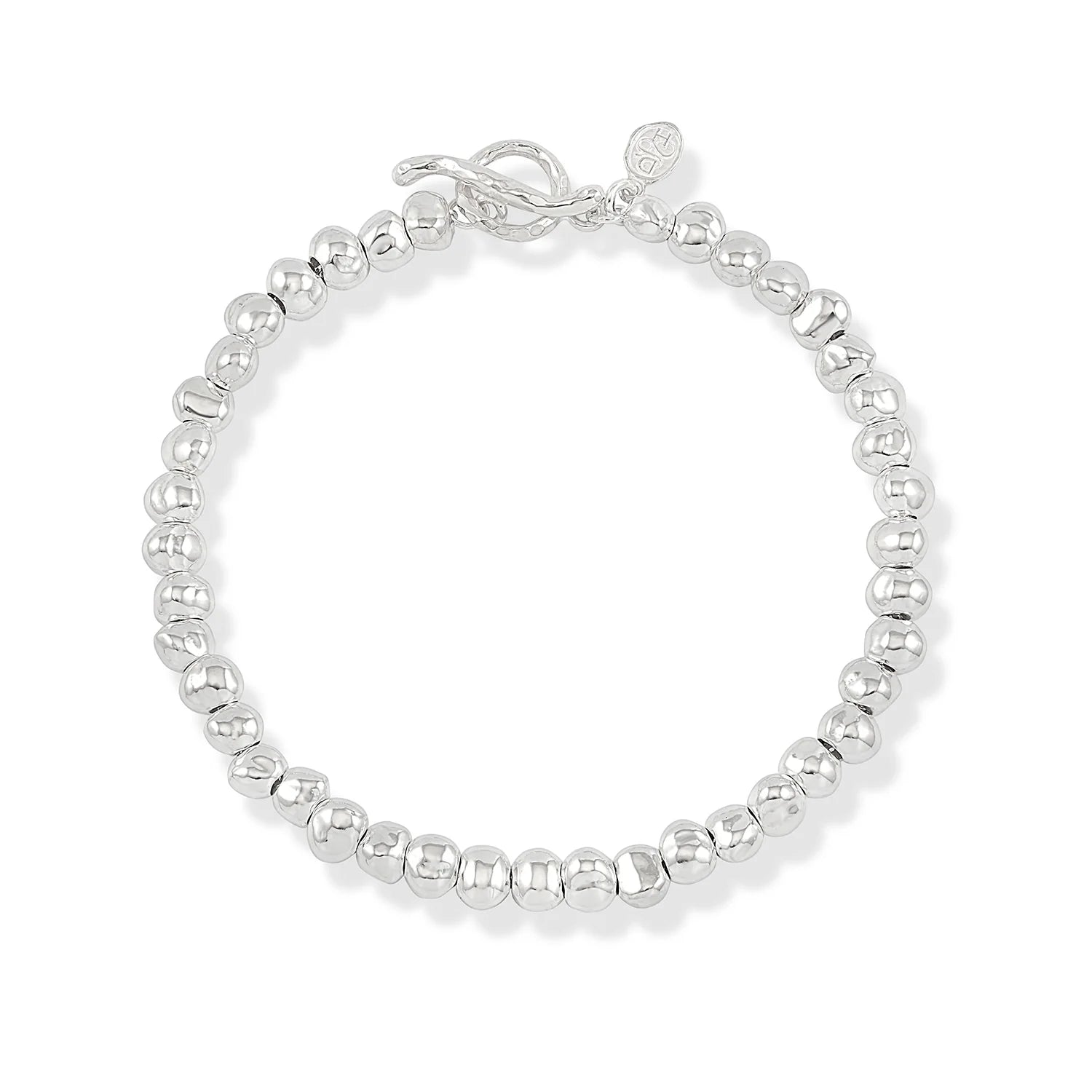 A sterling silver bracelet made of medium-sized nuggets threaded onto silver chain. The bracelet is finished with a signature hammered circle and t-bar clasp. A timeless classic.