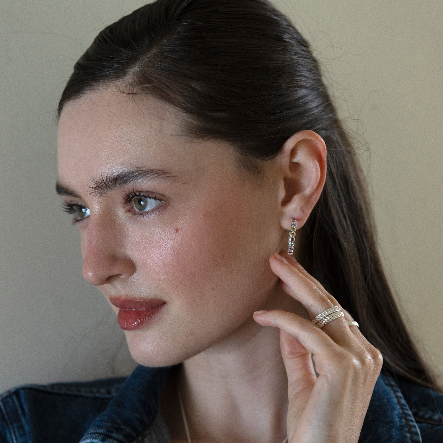 Beautifully handcrafted in London, this sterling silver hoop design is set with a rainbow of 9 gemstones including amethyst, blue topaz, garnet, citrine and white topaz. The earrings are complete with a radiant yellow gold vermeil finish. A timeless and classic jewellery box essential.