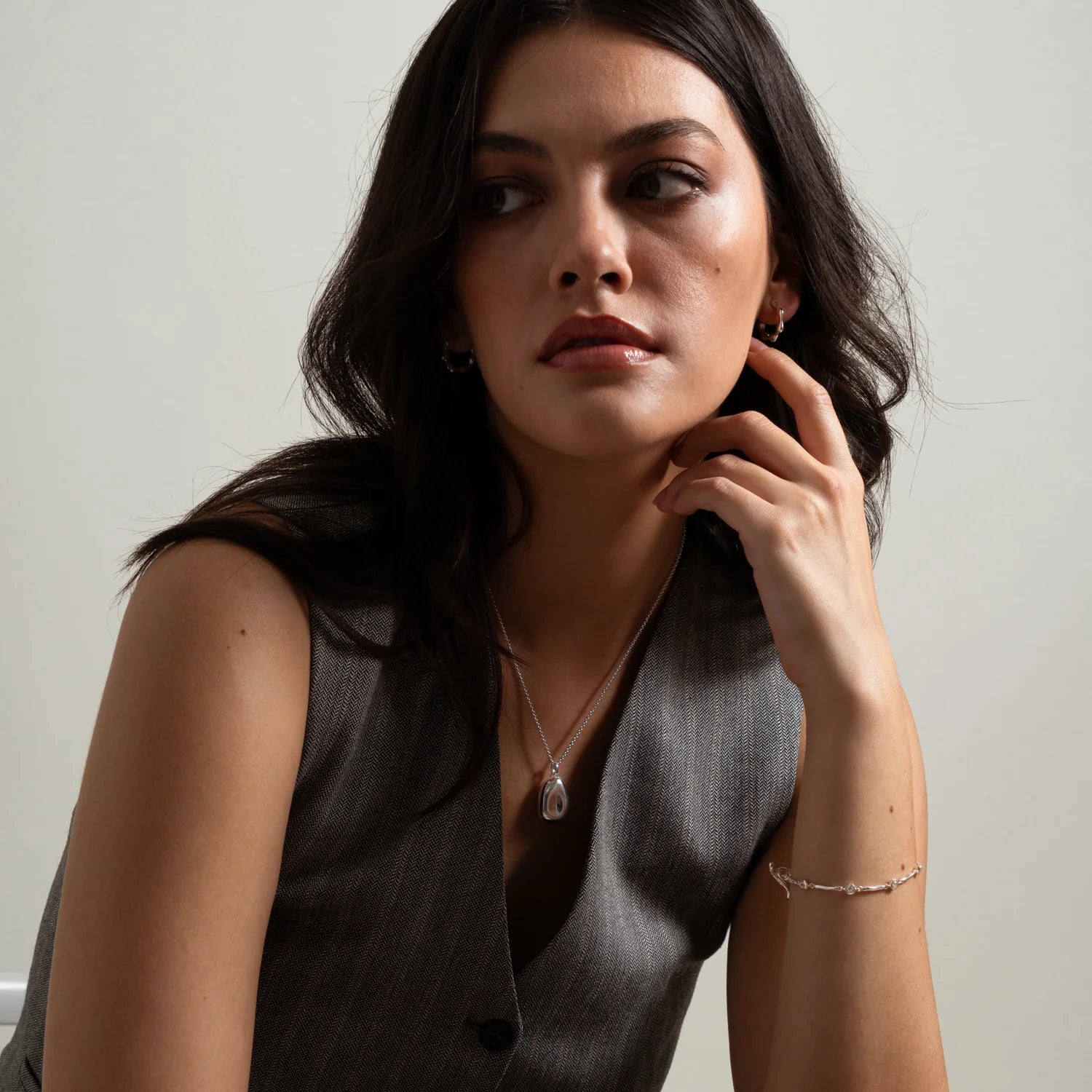 Perfect for day or night, this sterling silver Dewdrop bracelet features seven white sapphires encased in dainty nugget settings with long organic link spacers. Fastened securely with a signature t-bar & loop catch. Wear alone or stack with other bracelets for a layered look.