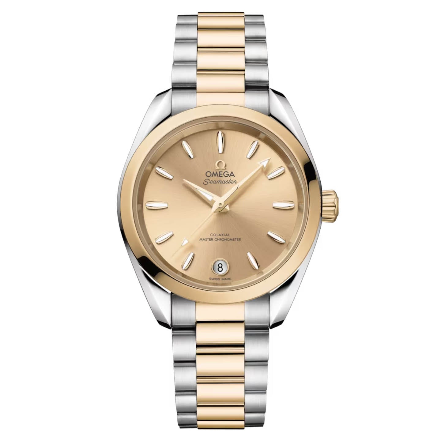 This 34 mm model, crafted in polished stainless steel and 18K Moonshine™ Gold, has a conical crown and wave-edged caseback with flat sapphire crystal. The sun-brushed and lacquered PVD-treated Moonshine™ Gold dial features a circular date window at 6 o’clock ringed in 18K Moonshine™ Gold. OMEGA has also used 18K Moonshine™ Gold for the facetted hands and distinctive hour-markers, which are shaped like sailboat hulls and filled with white Super-LumiNova.