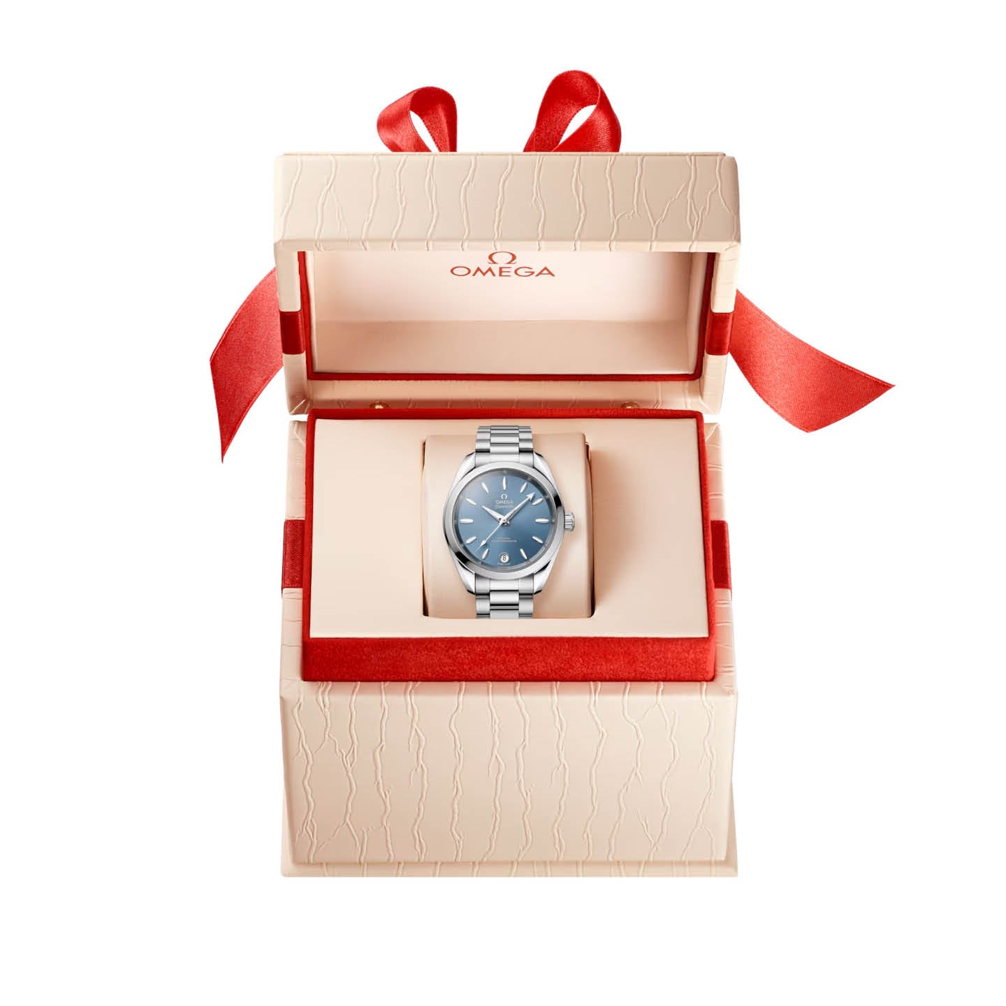 The sea blue dial, fashioned from brass, is lacquered and sun-brushed from the centre. The date window at 6 o’clock, hands, indexes and OMEGA logo are in diamond-polished 18K white gold.
