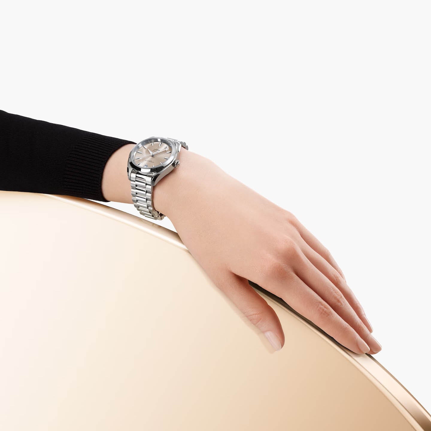 The sandstone dial, fashioned from brass, is lacquered and sun-brushed from the centre. The date window at 6 o’clock, hands, indexes and OMEGA logo are in diamond-polished 18K white gold.