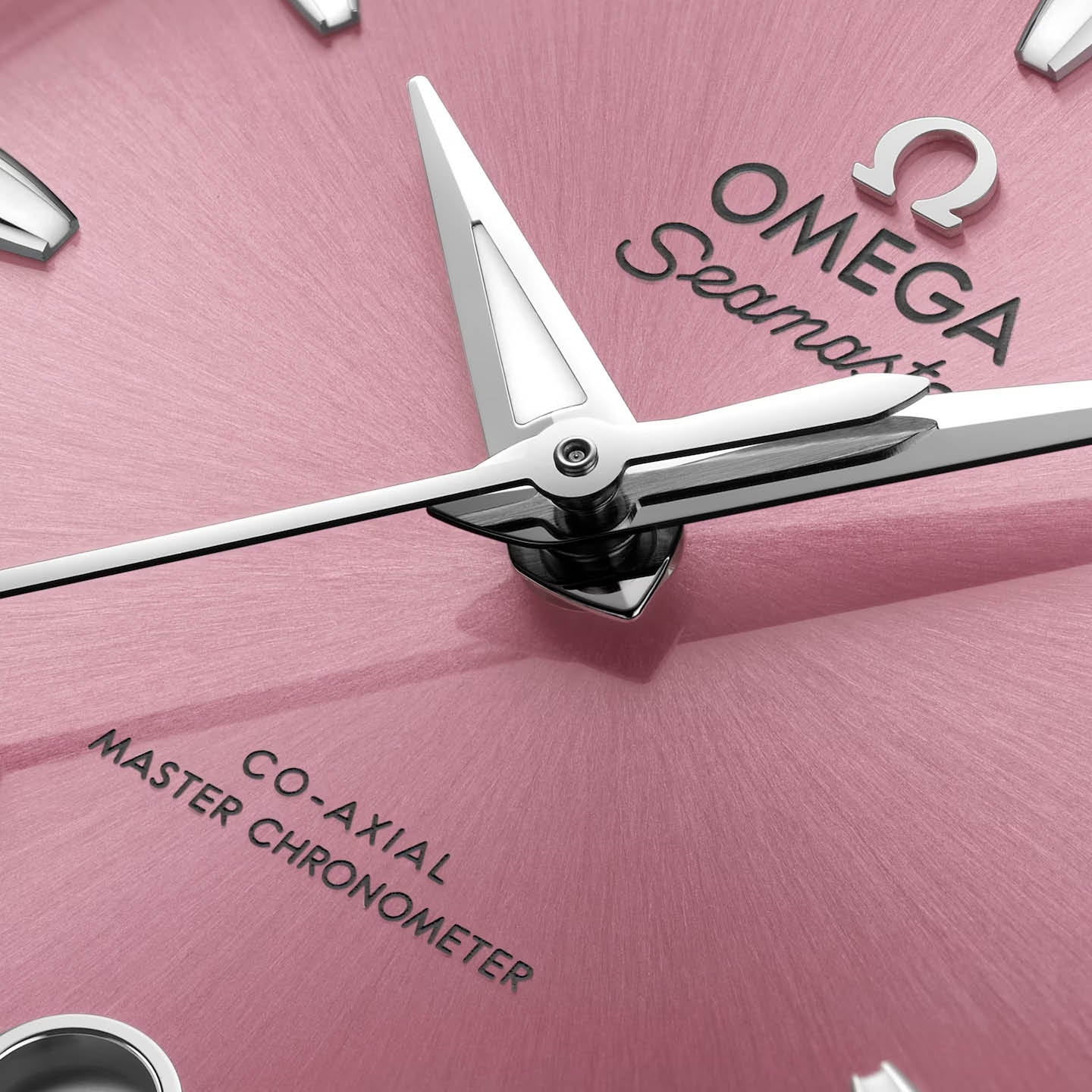 The shell pink dial, fashioned from brass, is lacquered and sun-brushed from the centre. The date window at 6 o’clock, hands, indexes and OMEGA logo are in diamond-polished 18K white gold.