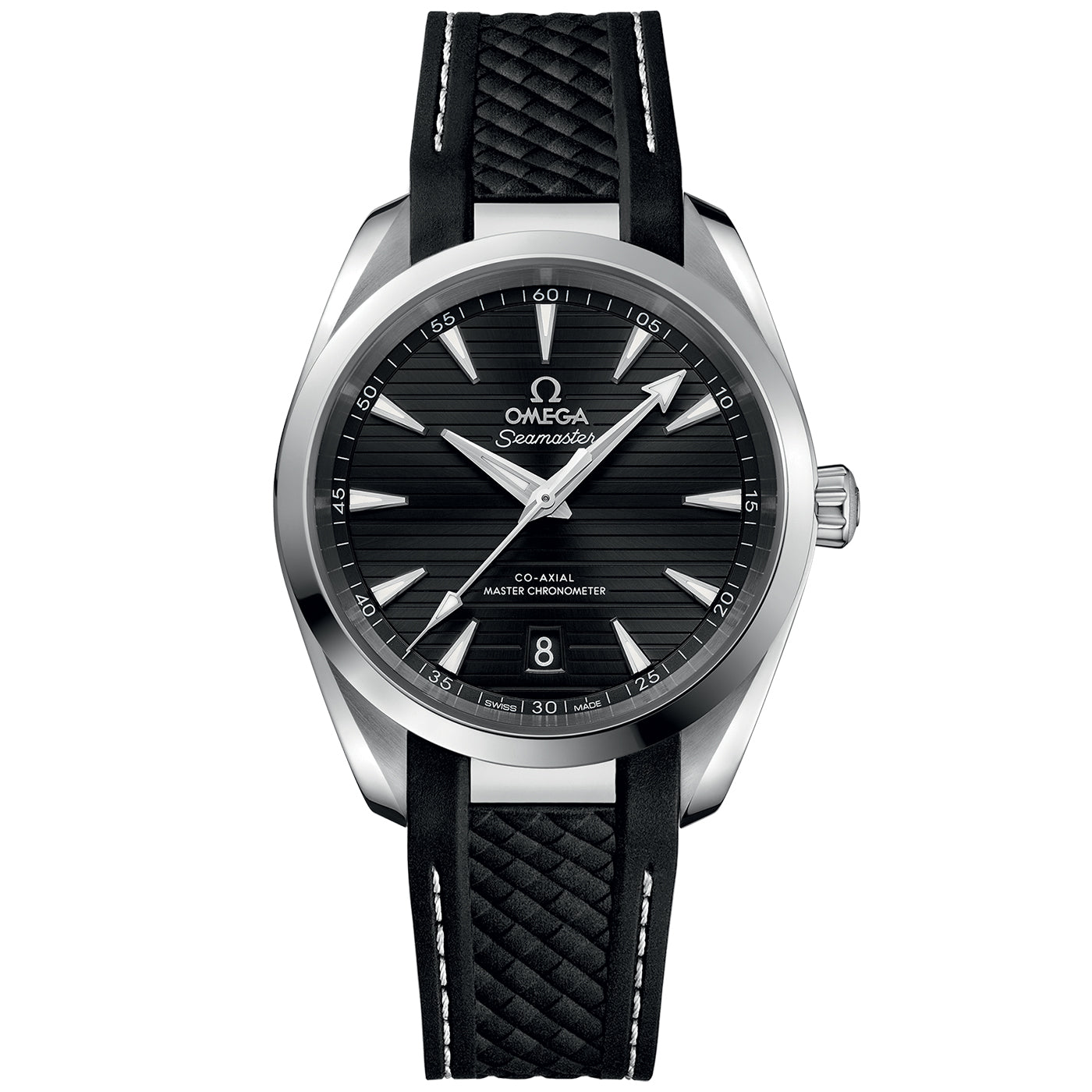 The black strap is made from structured rubber and includes grey lining and an additional stainless steel link which integrates it to the case. This certified chronometer is powered by the OMEGA Master Chronometer calibre 8800, certified at the industry’s highest standard by the Swiss Federal Institute of Metrology (METAS).