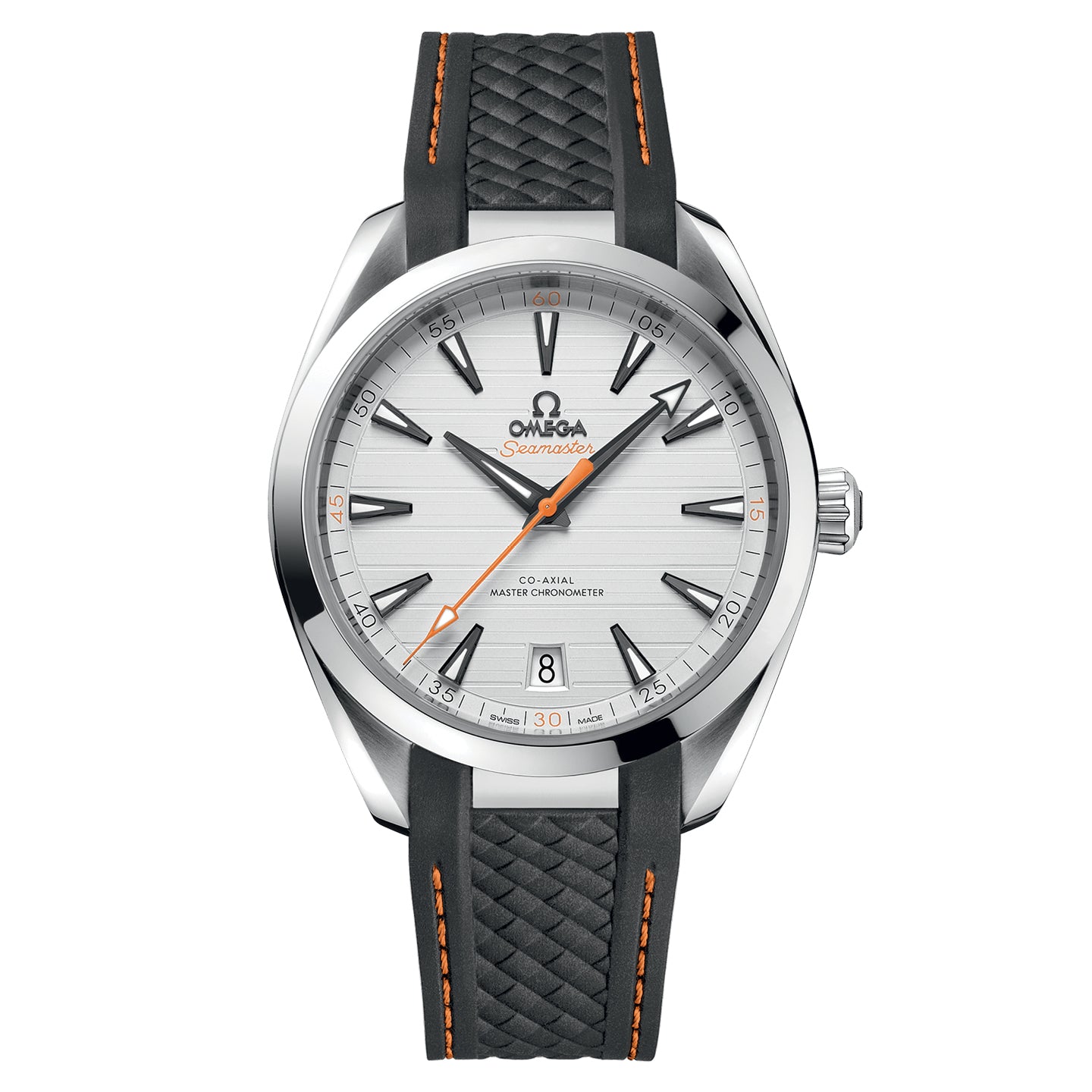The silvery dial is distinguished by a horizontal “teak” pattern which is inspired by the wooden decks of luxury sailboats. There is also a date window at 6 o’clock and blackened hands and indexes filled with white Super-LumiNova. Orange is used for the central seconds hand, the “Seamaster” wording and the four quarter numbers on the minute track.