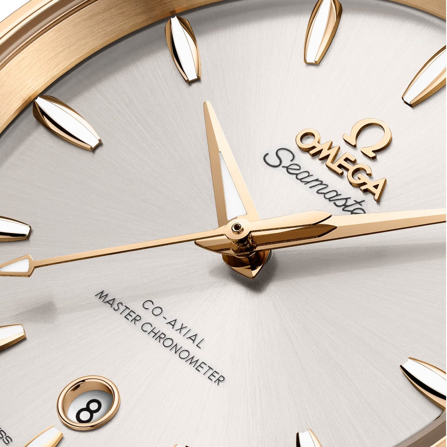 This 38 mm model, crafted in polished stainless steel and 18K Moonshine™ Gold, has a conical crown and wave-edged caseback with flat sapphire crystal. The sun-brushed and lacquered silvery dial features a circular date window at 6 o’clock ringed in 18K Moonshine™ Gold. OMEGA has also used 18K Moonshine™ Gold for the facetted hands and distinctive hour-markers, which are shaped like sailboat hulls and filled with white Super-LumiNova.