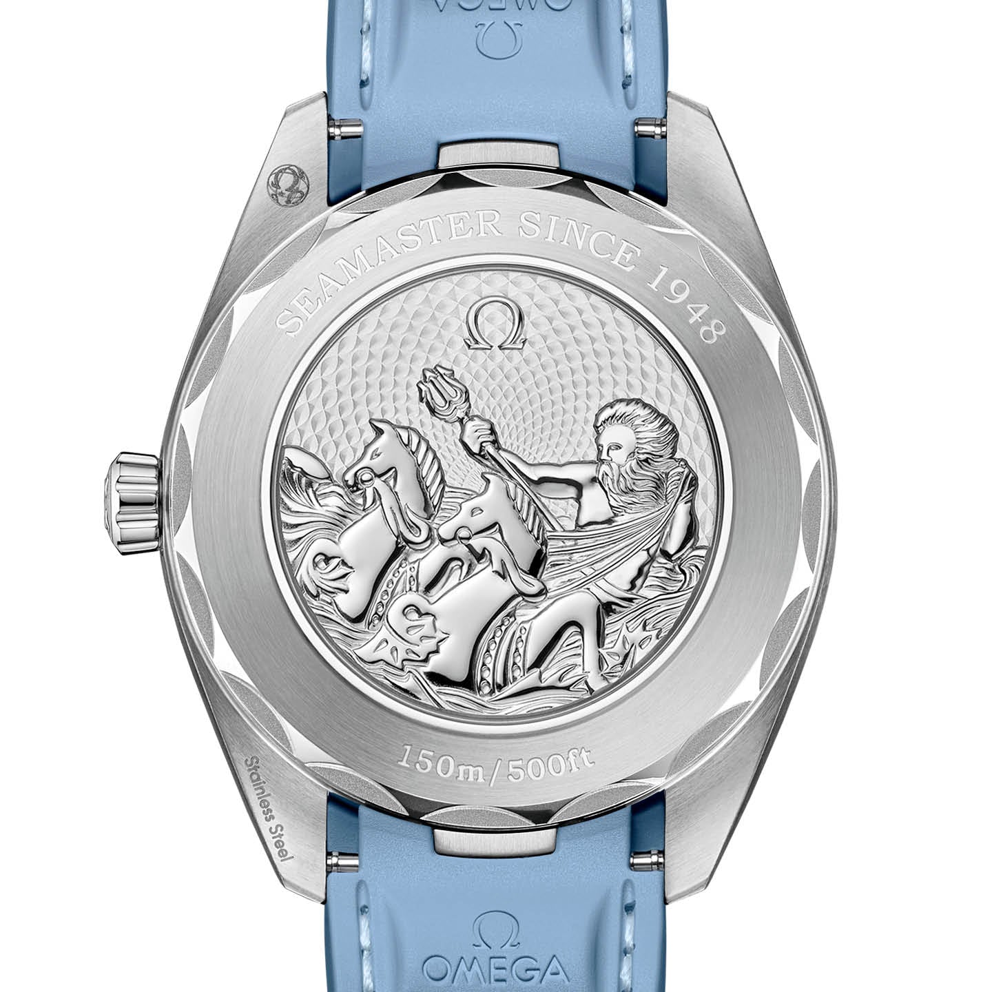 Turning the watch over reveals a stamped commemorative Seamaster logo depicting a trident-bearing Poseidon and two seahorses: OMEGA’s 1956 original and the brand’s current design. Behind which sits OMEGA’s Co-Axial Master Chronometer calibre 8900, certified at the industry’s highest level by the Swiss Federal Institute of Metrology (METAS).