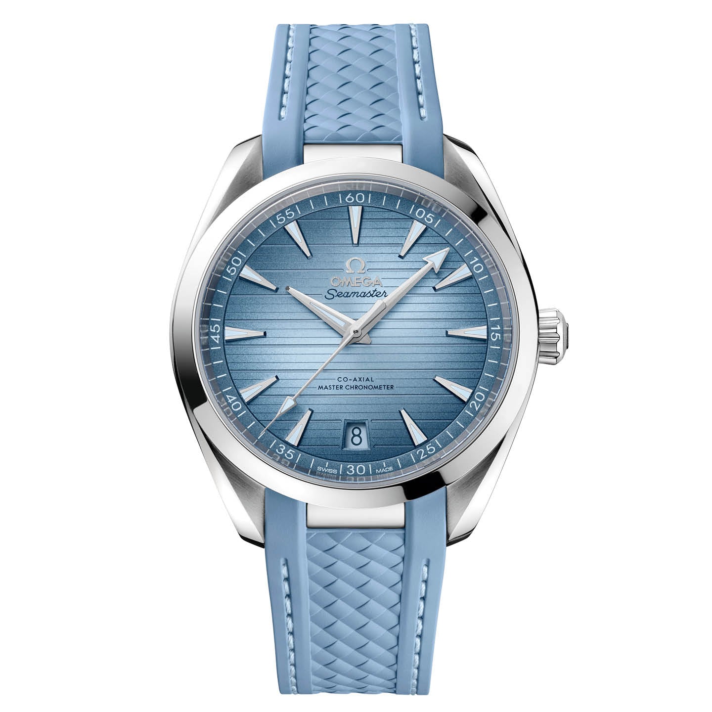 The teak pattern dial, in OMEGA’s own Summer Blue, is sun-brushed, PVD-treated, and varnished with a gradient finish to reflect the watch’s level of water resistance. It has rhodium-plated hands and indexes filled with a unique light blue Super-LumiNova and a matching blue date window indicator at 6 o’clock.