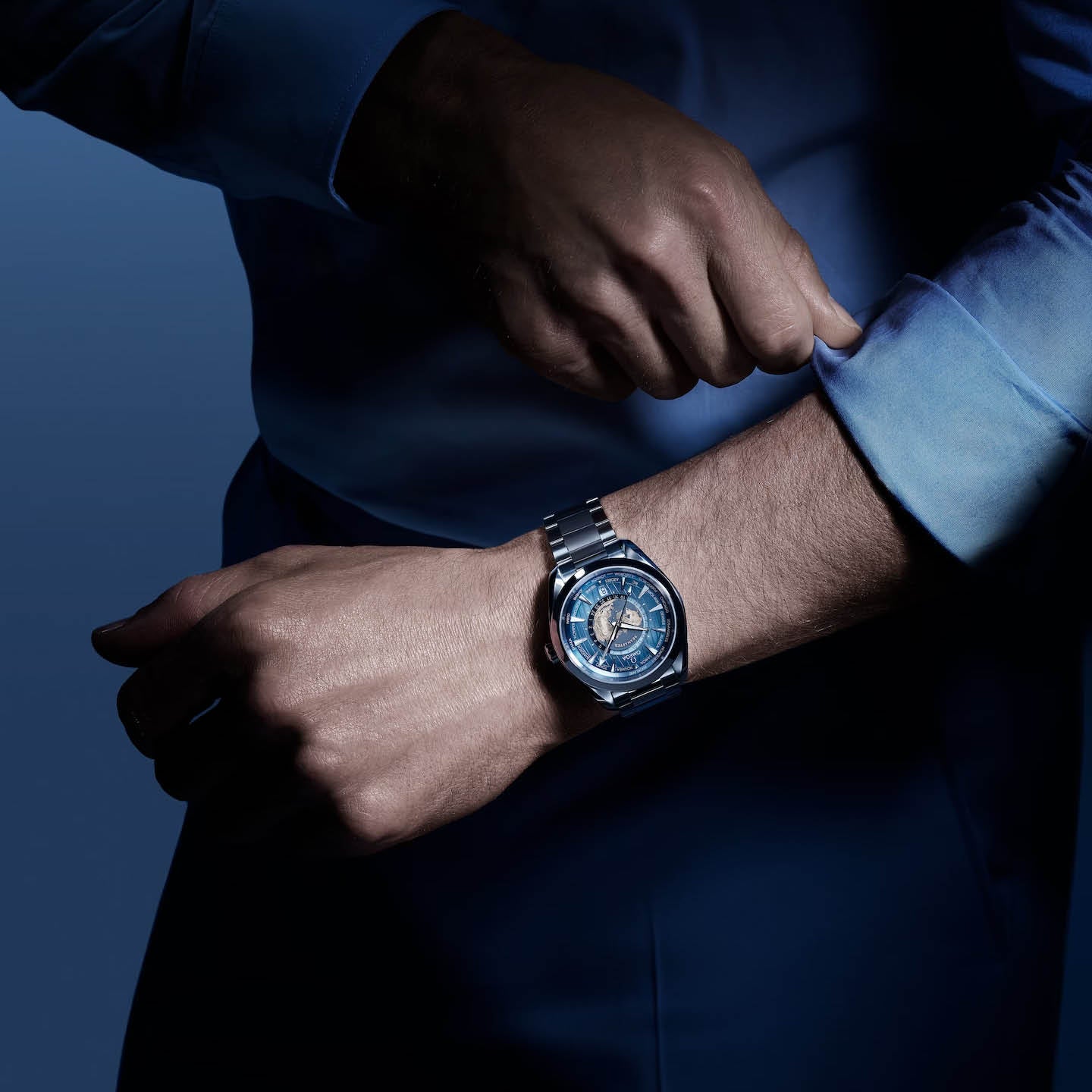 Around the dial is a circle of silvery printed global destinations. The centre contains a 24-hour glass ring, with light blue to indicate daytime and dark blue to indicate night. The vision of Earth, which depicts a blue ocean and relief of the continents, is laser-ablated on a grade 5 titanium plate.