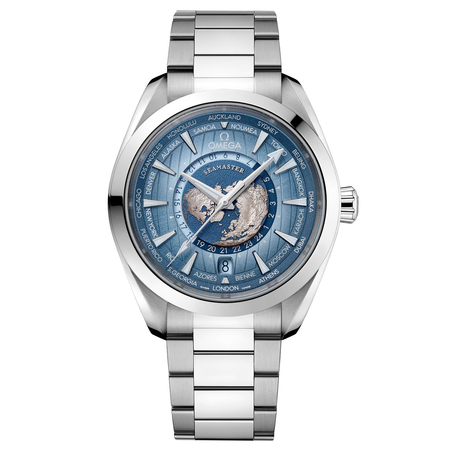 This 43 mm Worldtimer, with its case in polished and brushed stainless steel, has a matching bracelet.