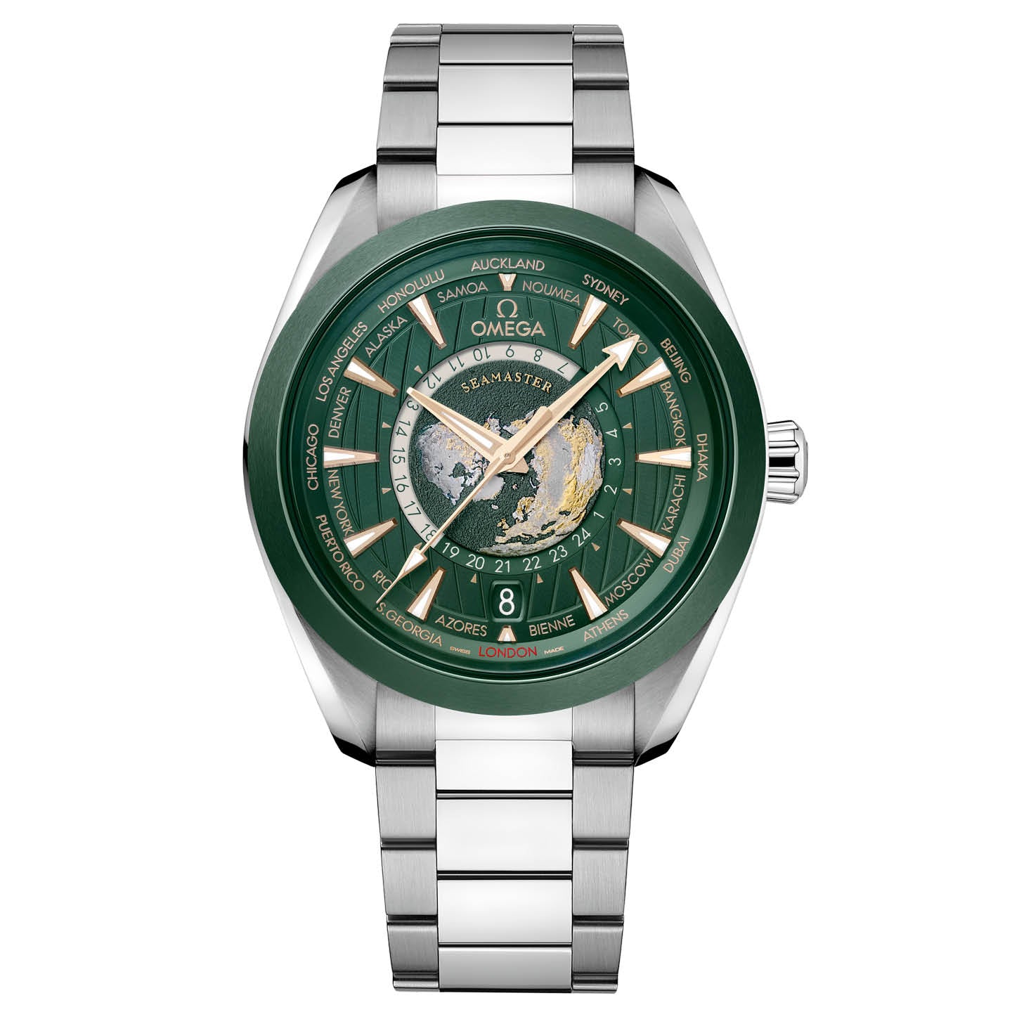 At the centre of the sun-brushed green dial, framed by a polished-brushed green ceramic bezel, OMEGA has produced a vision of Earth, viewed from above the North Pole, by laser-ablating continents and colours on a grade 5 titanium surface. Circling the topographic map is a 24-hour indication, divided into night and day sections.
