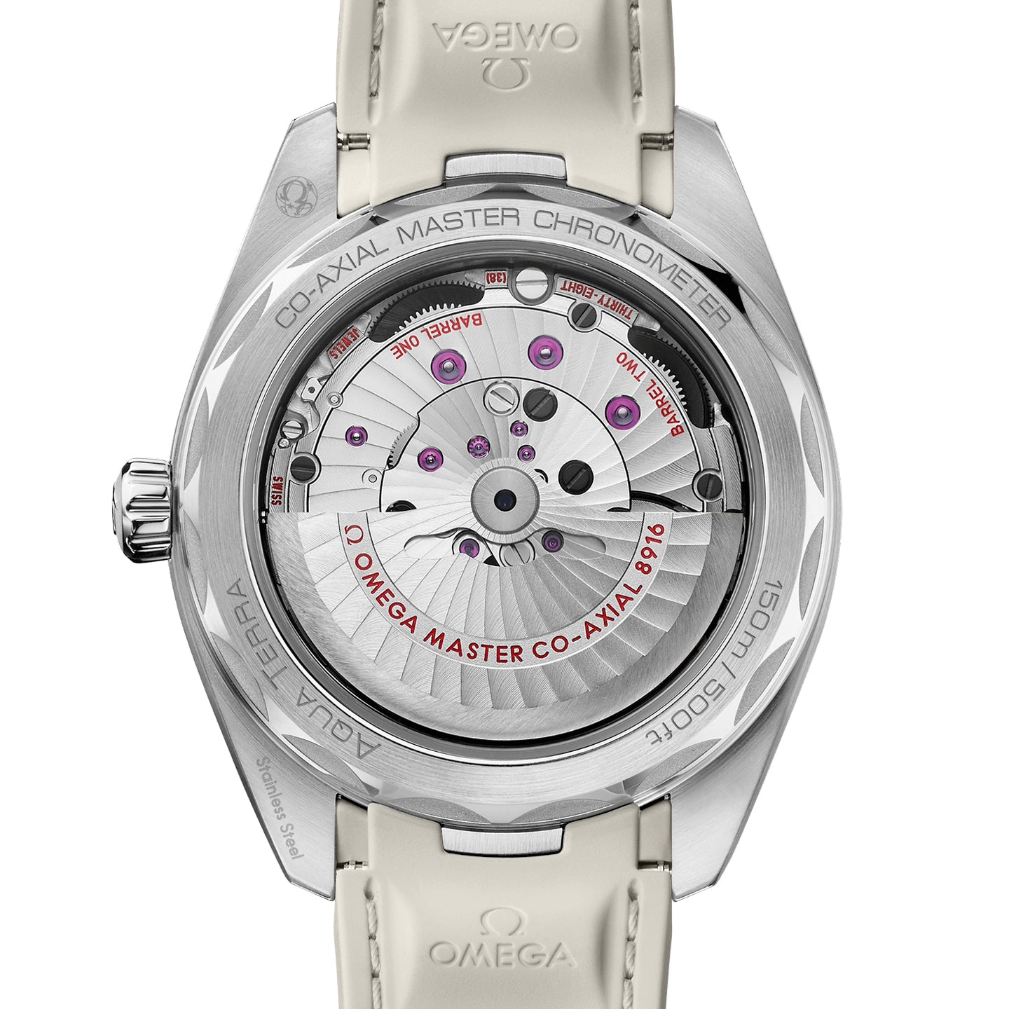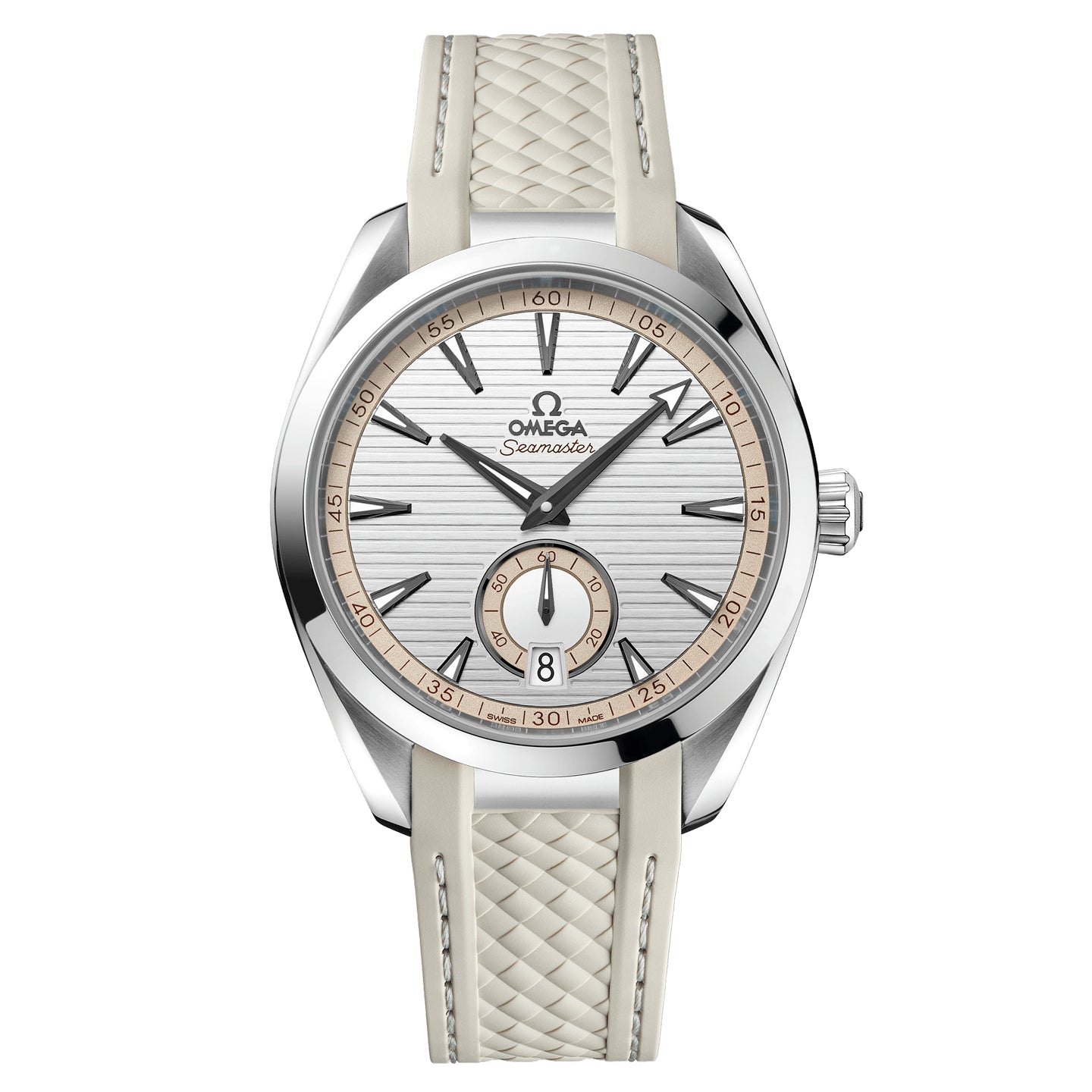 Presented on a structured beige rubber strap with grey stitching, this timepiece is powered by the OMEGA Co-Axial Master Chronometer calibre 8916, certified at the industry’s highest standard by the Swiss Federal Institute of Metrology (METAS).