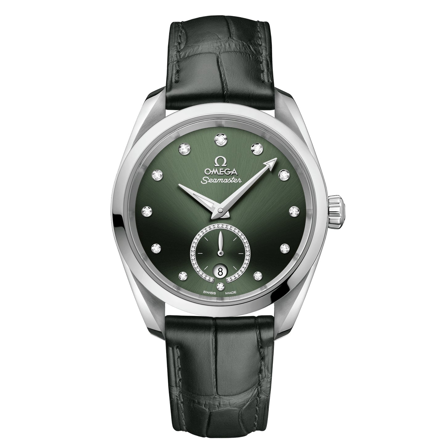 Presented on a dark green leather strap, this timepiece is powered by the OMEGA Co-Axial Master Chronometer calibre 8802, certified at the industry’s highest standard by the Swiss Federal Institute of Metrology (METAS).