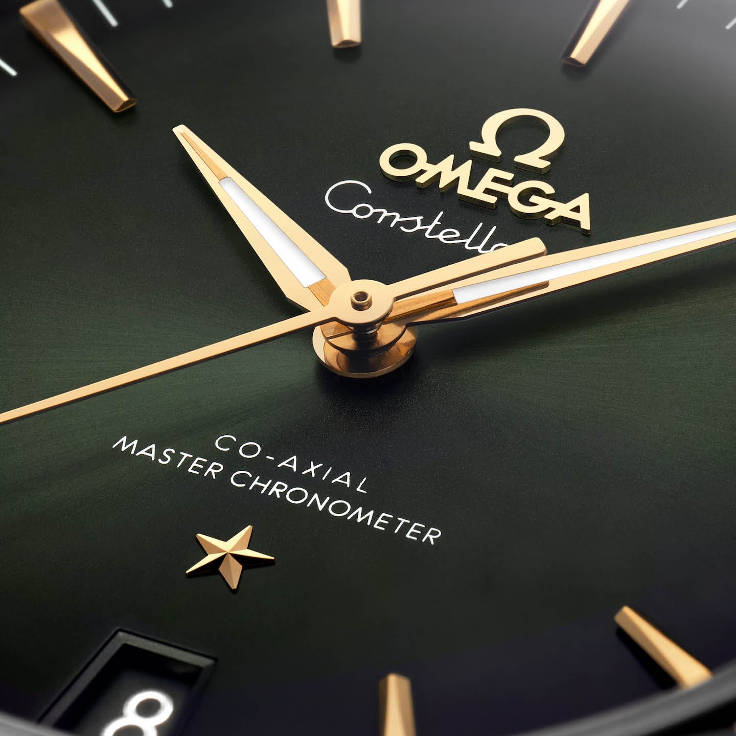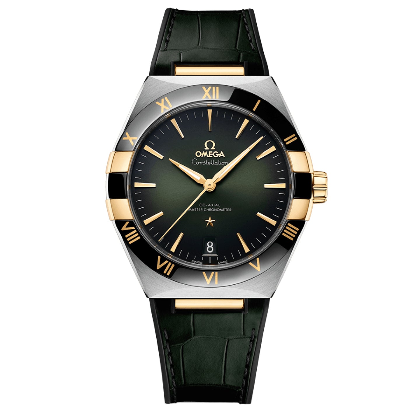 This 41 mm model, in stainless steel and 18K Yellow gold, features a black polished ceramic bezel ring with Roman numerals filled with OMEGA Ceragold™. It has a sun-brushed green dial with a gradient effect and a date window at the 6 o’clock position. The hands, OMEGA logo, Constellation star and indexes are also in 18K Yellow gold.