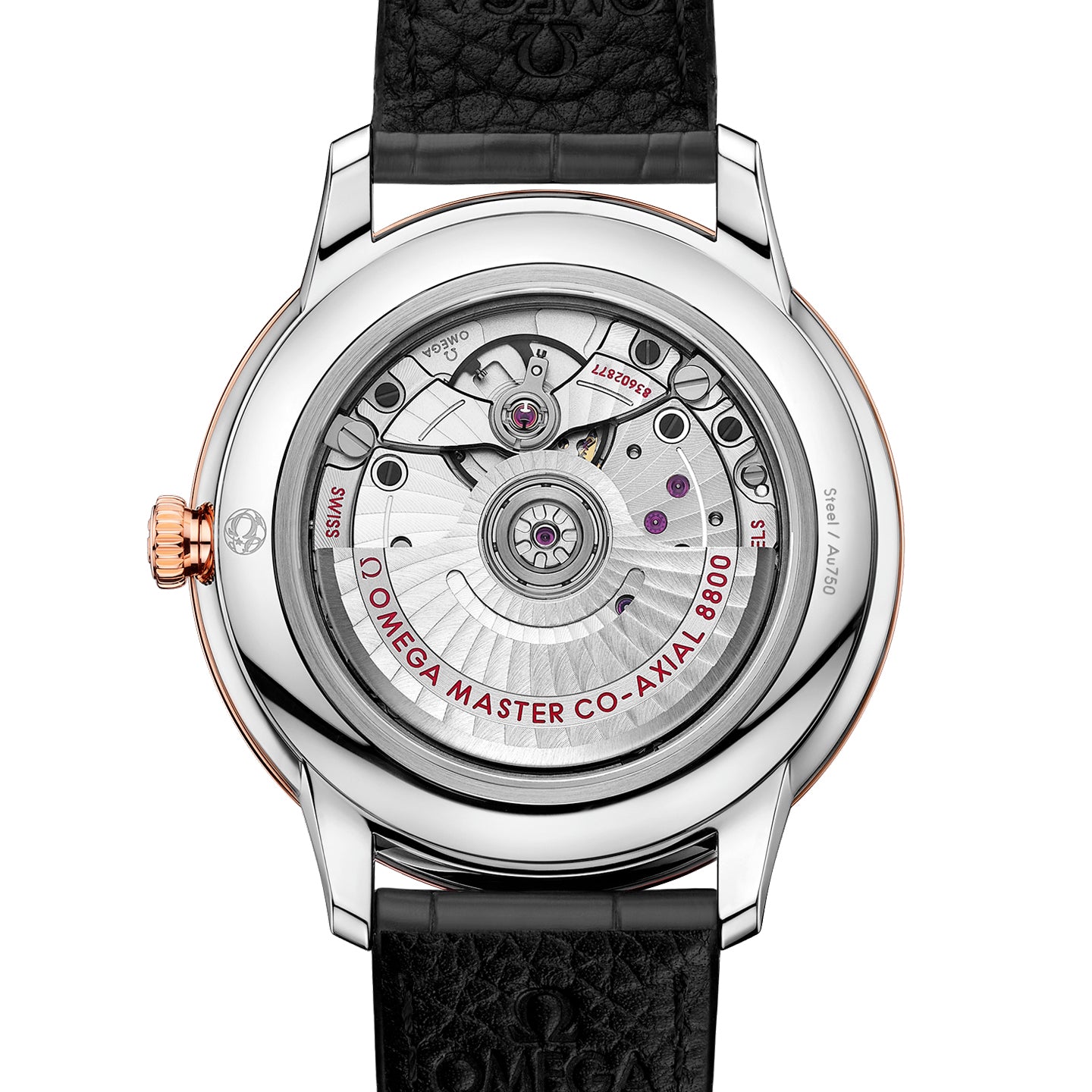 This Master Chronometer certified watch is presented on a dark grey leather strap and is driven by the OMEGA Master Co-Axial Calibre 8800, which can be admired through the scratch-resistant sapphire crystal caseback.