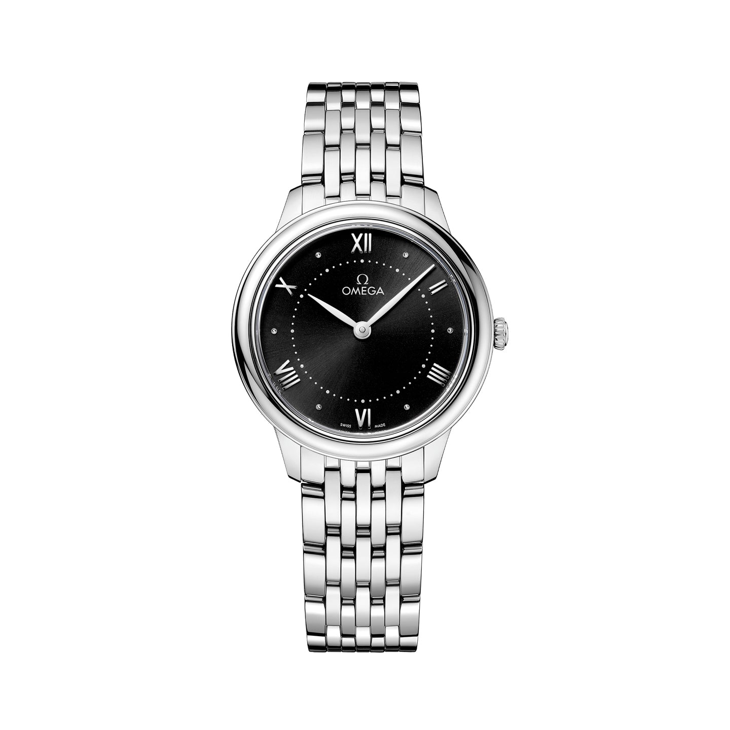 This watch is presented on a stainless steel bracelet and is driven by the OMEGA Quartz Calibre 4061, with a battery life of at least 48 months.