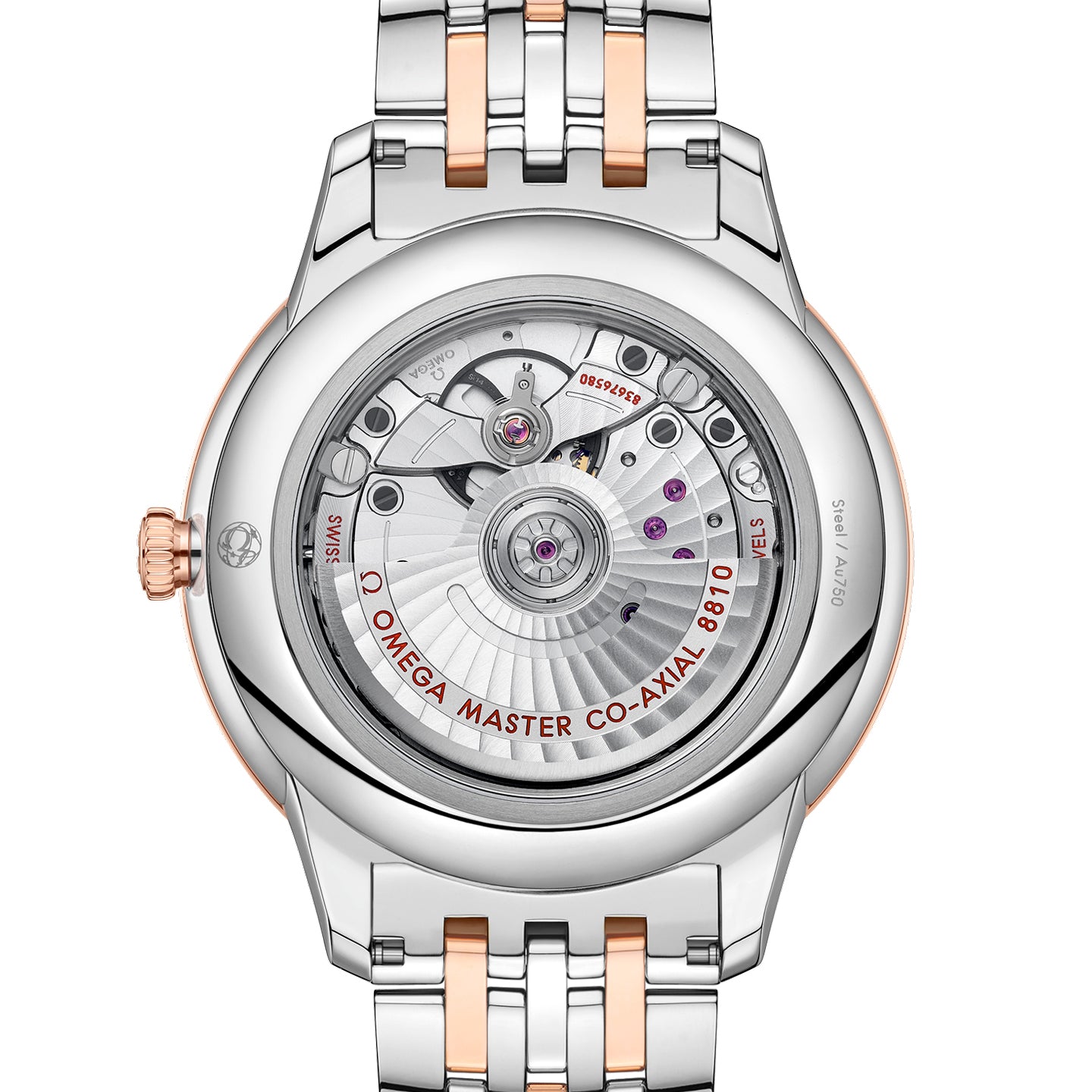 This Master Chronometer certified watch is presented on a stainless steel - Sedna™ Gold bracelet and is driven by the OMEGA Master Co-Axial Calibre 8810, which can be admired through the scratch-resistant sapphire crystal caseback.