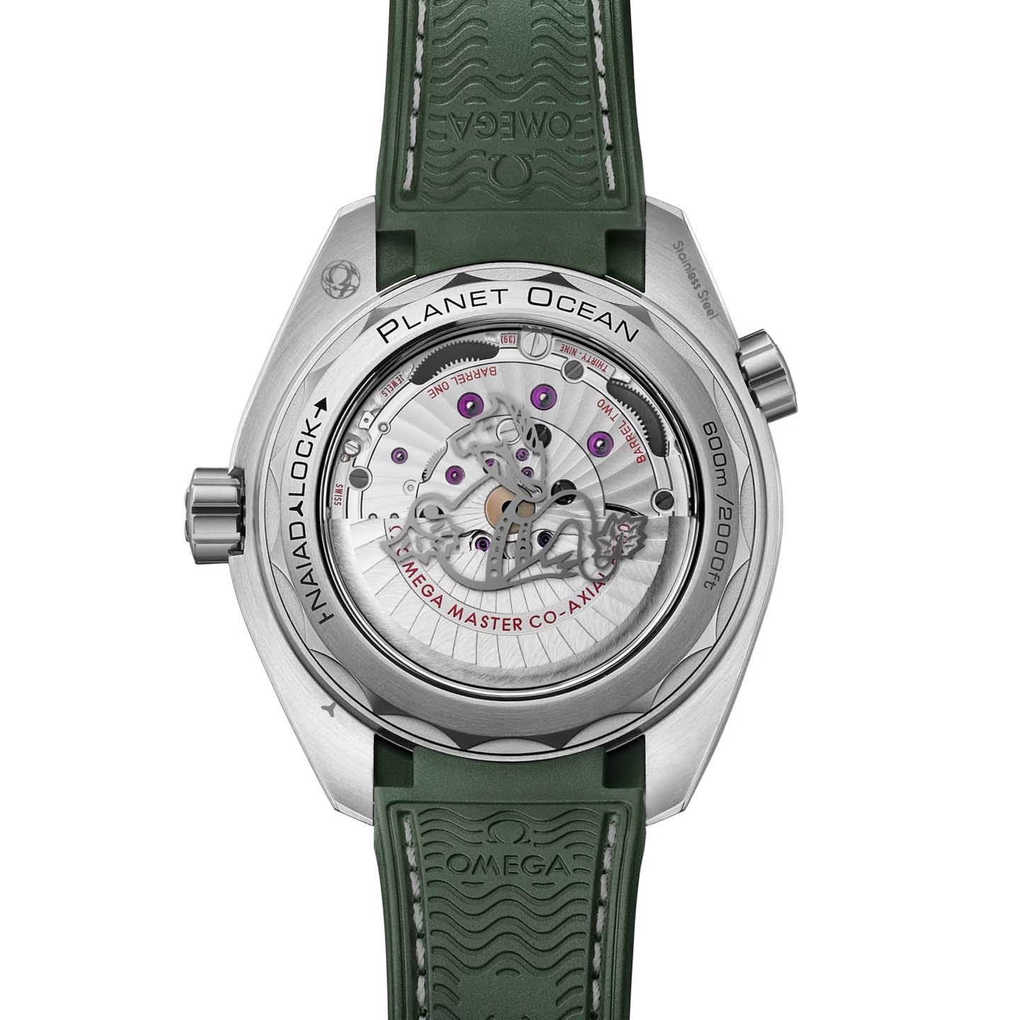 Powered by the Co-Axial Master Chronometer Calibre 8900, this Seamaster Planet Ocean is worn on an integrated green rubber strap with a structured pattern and light grey and green stitching. The NAIAD LOCK caseback is completed with a metallized seahorse on the sapphire crystal.