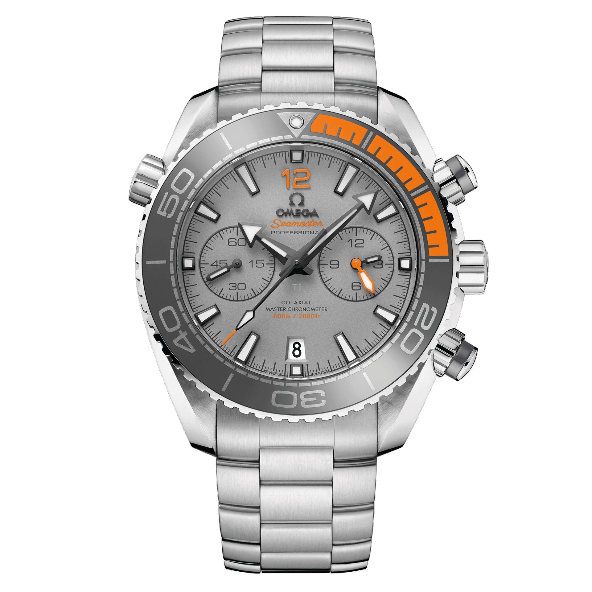This model, with its scratch-resistant sapphire crystal, features a sand-blasted grade 5 titanium dial with Arabic numerals and a date window at the 6 o’clock position. The dial presents a small seconds sub-dial, as well as 60-minute and 12-hour counters on one dial for intuitive reading of elapsed time. Mounted on the 45.5 mm grade 5 titanium case, is the world’s premiere grey silicon nitride ceramic bezel with orange rubber. The diving scale of the bezel is crafted with Liquidmetal™.