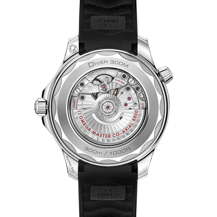 The watch is presented on a black rubber strap and is driven by the OMEGA Master Chronometer Calibre 8800, which can be seen through the sapphire-crystal on the wave-edged caseback.