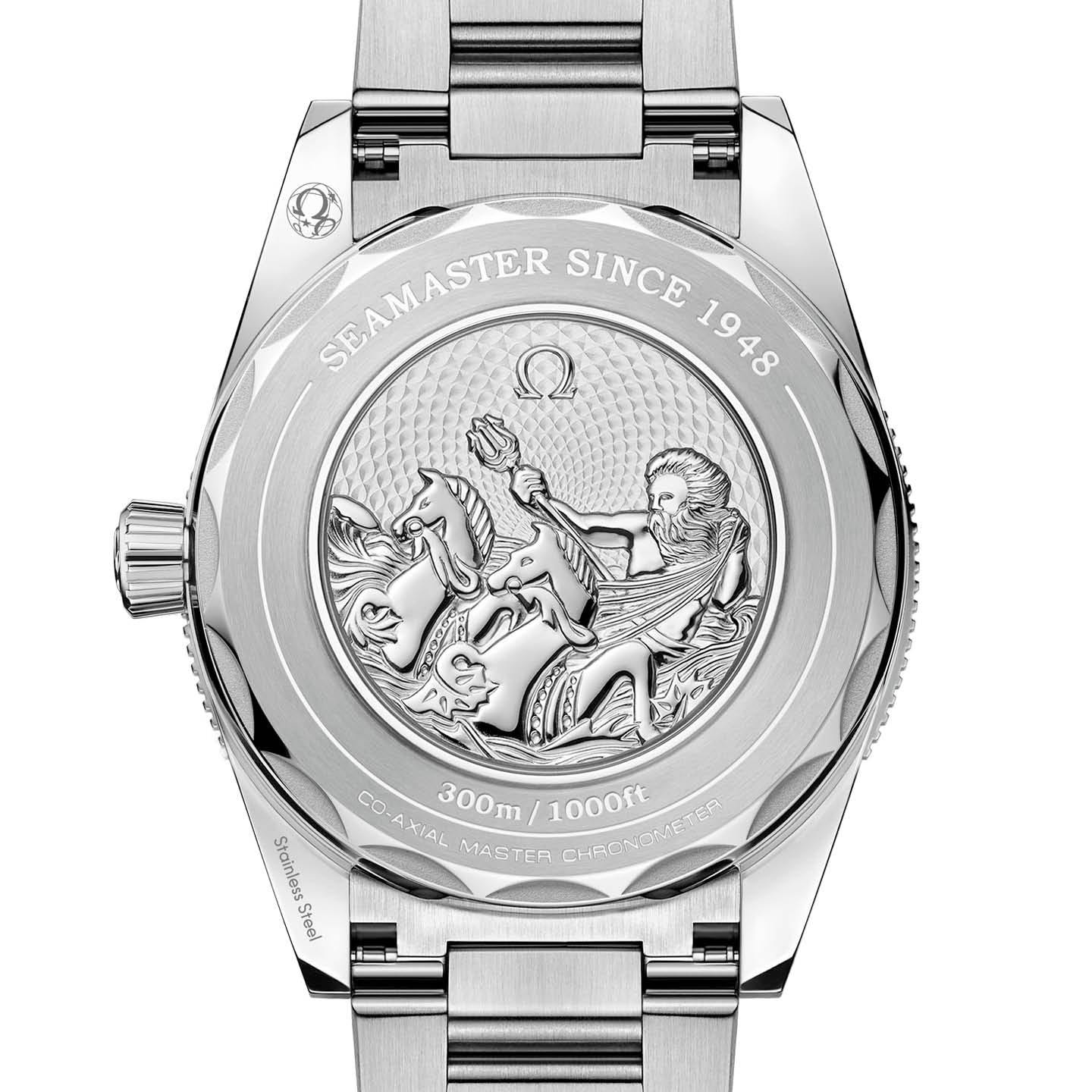 Turning the watch over reveals a stamped commemorative Seamaster logo depicting a trident-bearing Poseidon and two seahorses: OMEGA’s 1956 original and the brand’s current design. Behind which sits OMEGA’s Co-Axial Master Chronometer calibre 8912, certified at the industry’s highest level by the Swiss Federal Institute of Metrology (METAS).