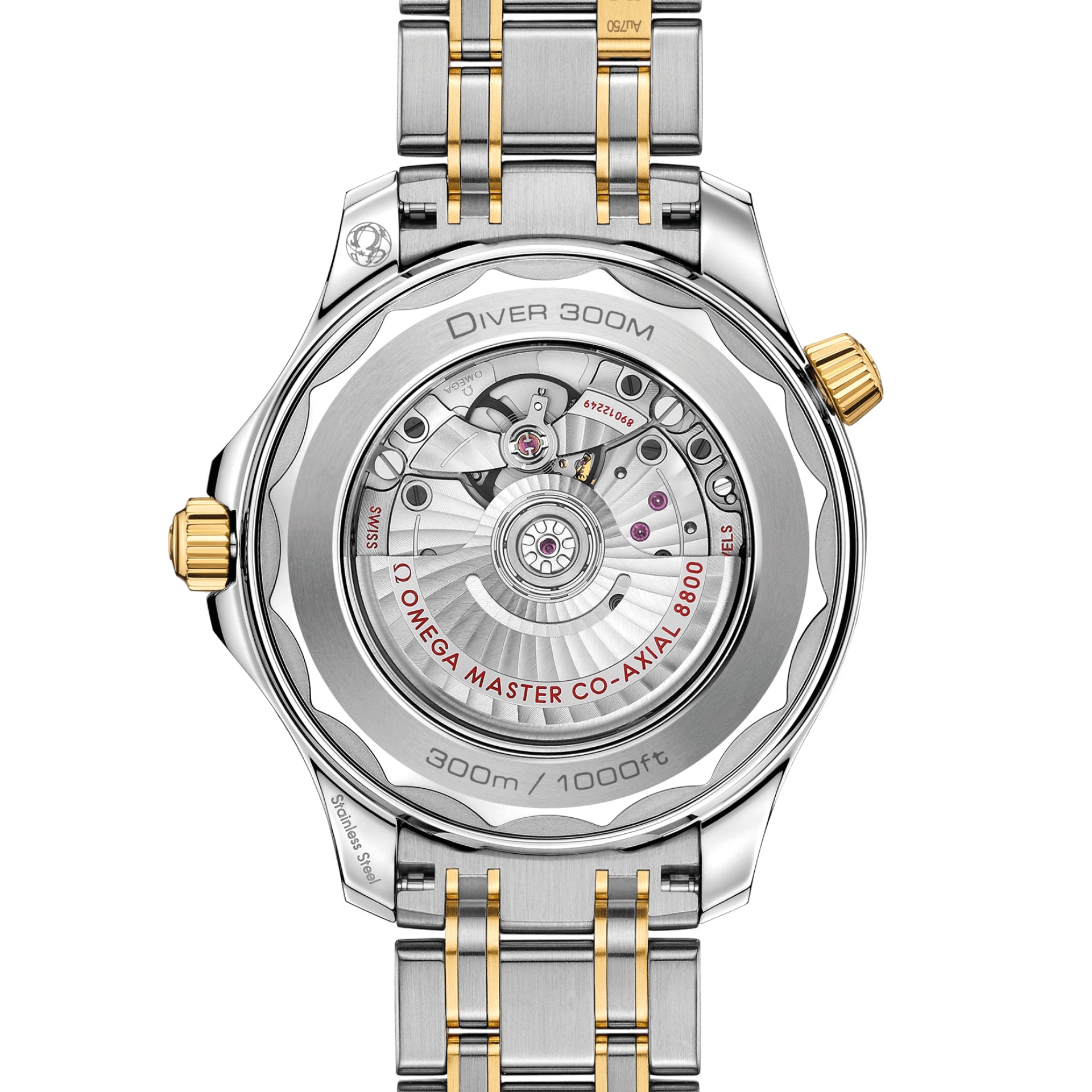Turn the watch over and you will see the OMEGA Master Chronometer Calibre 8800 through the sapphire-crystal caseback. This movement provides Swiss-certified accuracy, resistance to magnetic fields, and an impressive 80-hour power reserve. Therefore, the Omega Seamaster Diver 300M 210.20.42.20.01.002 is as dependable as it is stylish.