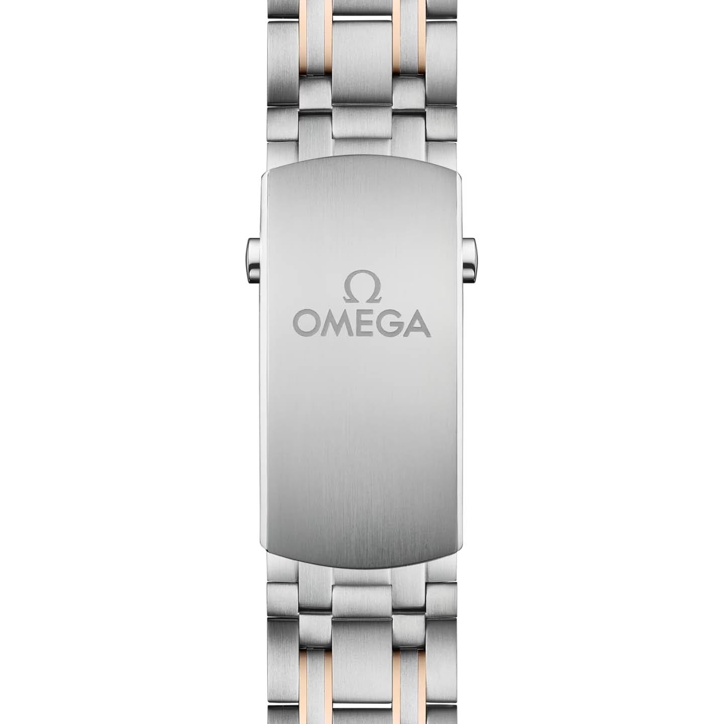 The watch is presented on a stainless steel and 18K Sedna™ gold bracelet and is driven by the OMEGA Master Chronometer Calibre 8800, which can be seen through the sapphire-crystal on the wave-edged caseback.