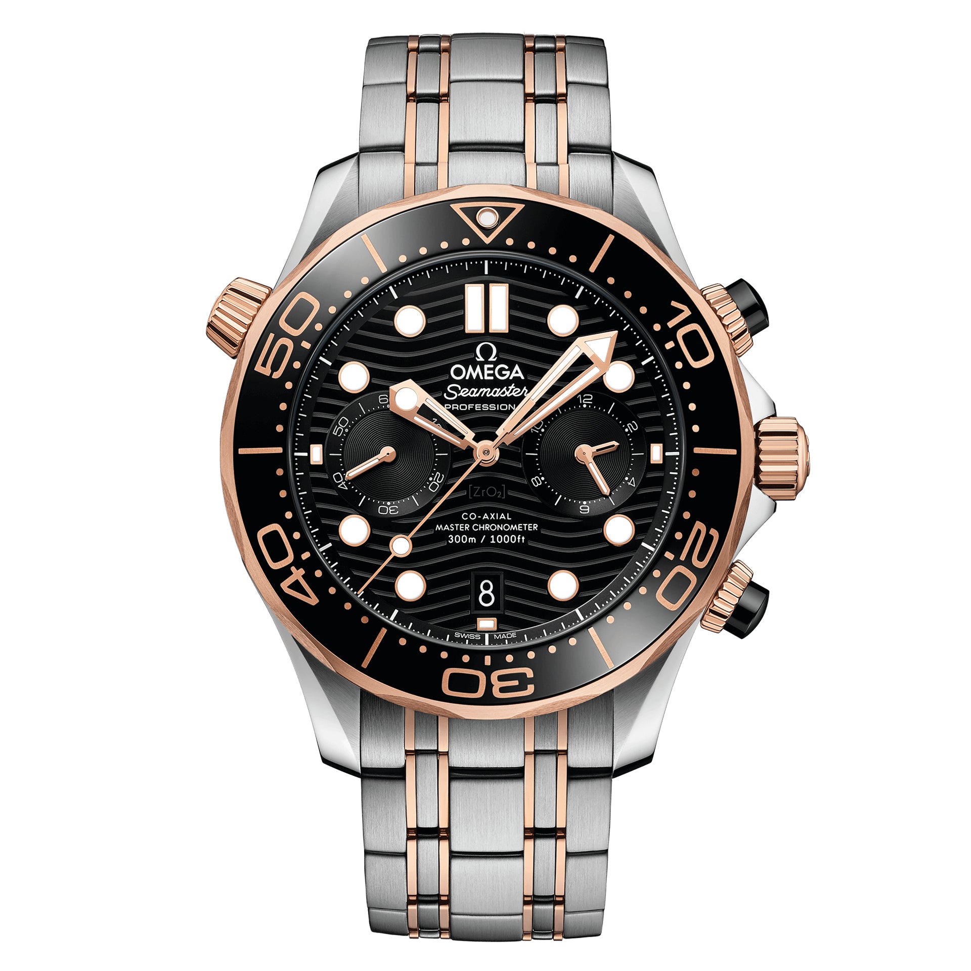 This 44 mm chronograph model is crafted from stainless steel and 18K Sedna™ gold, and includes a polished black ceramic bezel with a Ceragold™ diving scale. The pushers are also polished black ceramic, as well as the dial which features laser-engraved waves and a date window at 6 o’clock.