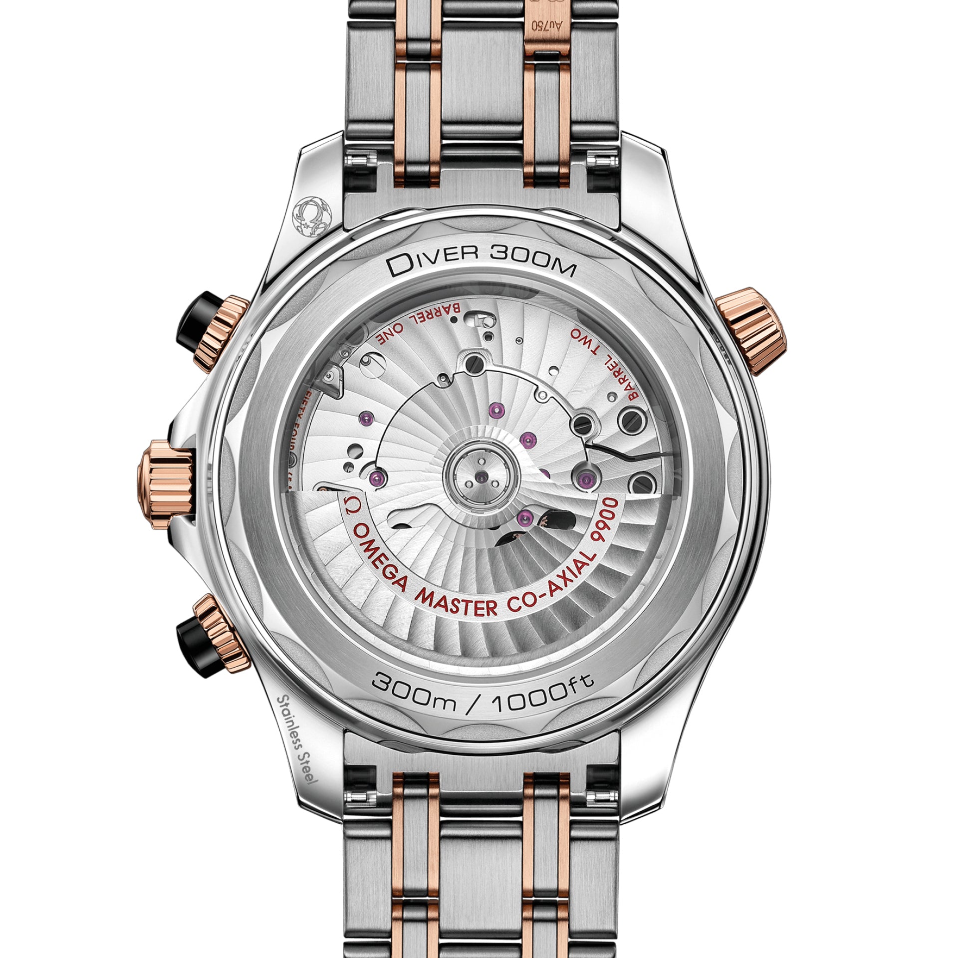The watch is presented on a stainless steel and 18K Sedna™ gold bracelet and is driven by the OMEGA Master Chronometer Calibre 9900, which can be seen through the sapphire-crystal on the wave-edged caseback.