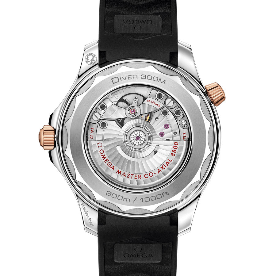 The skeleton hands and raised indexes are 18ct Sedna™ gold and are filled with white Super-LumiNova, while the helium escape valve has been given a conical design. The watch is presented on a black rubber strap and is driven by the OMEGA Master Chronometer Calibre 8800, which can be seen through the sapphire-crystal on the wave-edged caseback.