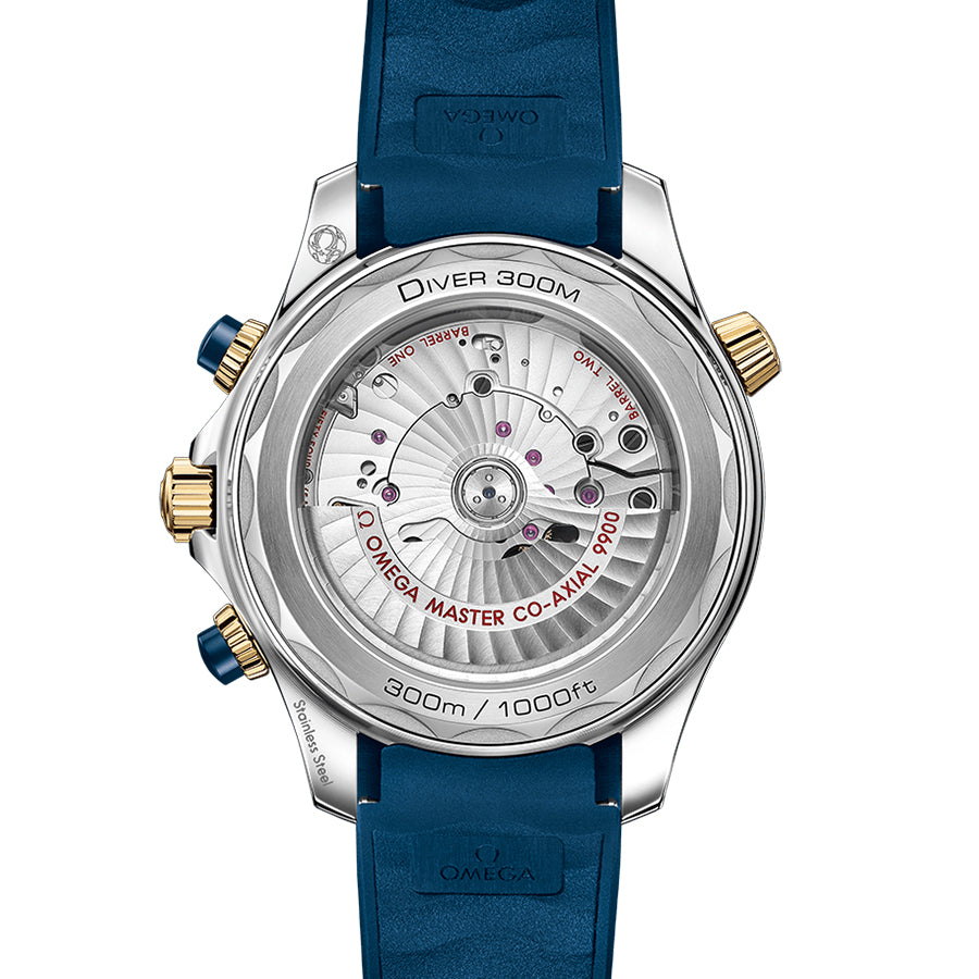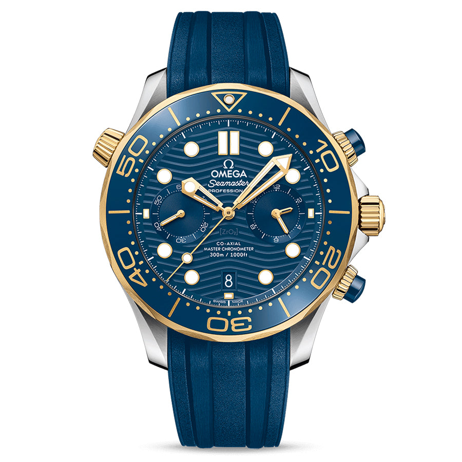 Since 1993, the Seamaster Professional Diver 300M has enjoyed a legendary following. Today’s modern collection has embraced that famous ocean heritage and updated it with OMEGA’s best innovation and design. This 44 mm chronograph model is crafted from stainless steel and 18K Sedna™ gold and includes a polished blue ceramic bezel with a Ceragold™ diving scale. The pushers are also polished blue ceramic, as well as the dial which features laser-engraved waves and a date window at 6 o’clock. The subdial hands are 18K Sedna™ gold, along with all other hands and indexes which are filled with white Super-LumiNova. The watch is presented on a blue rubber strap and is driven by the OMEGA Master Chronometer Calibre 9900, which can be seen through the sapphire-crystal on the wave-edged caseback.