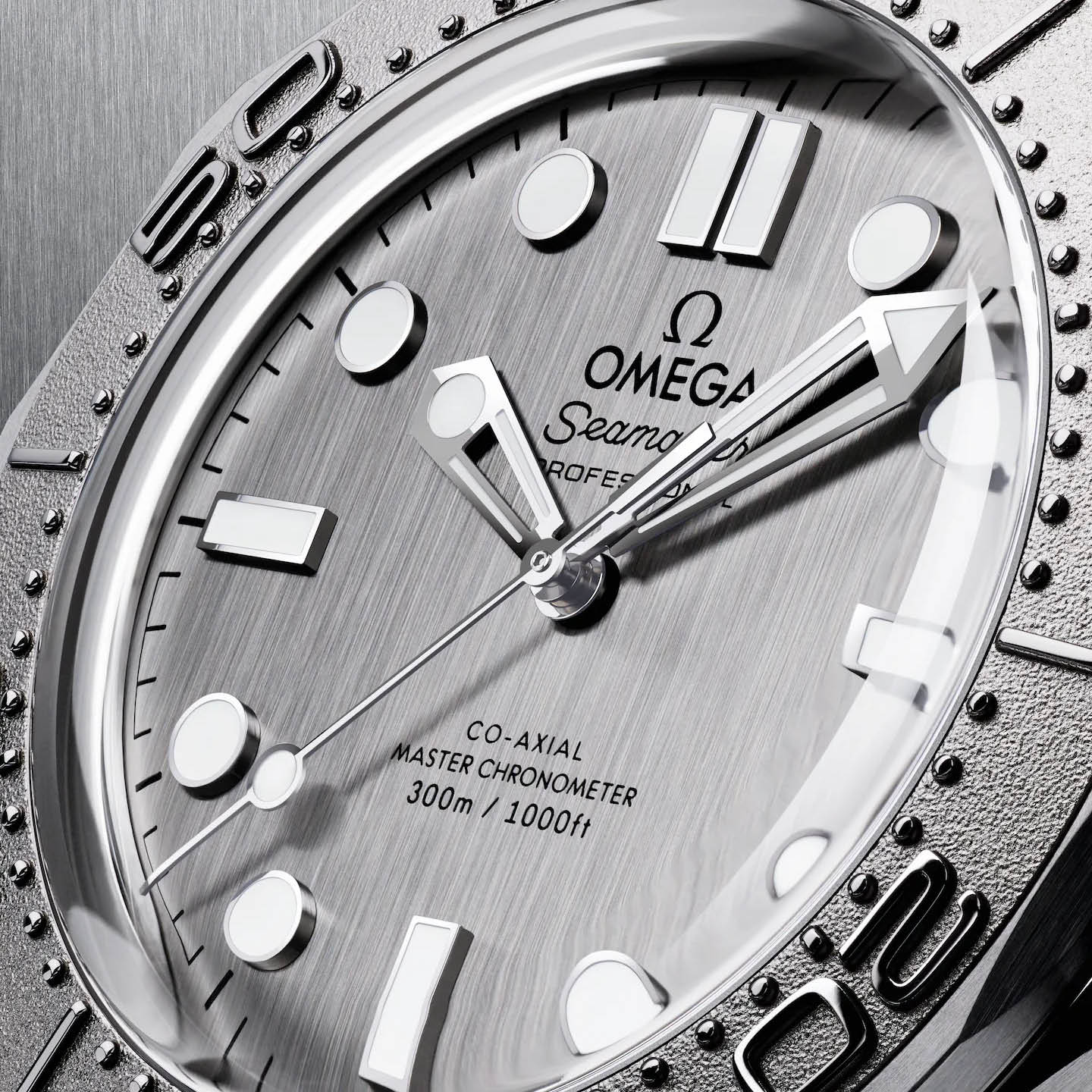 PVD stainless steel is used to create the brushed dial as well as the polished and skeletonized hands and indexes, which are filled with white Super-LumiNova. Other markings, including the OMEGA logo, are transferred in black.