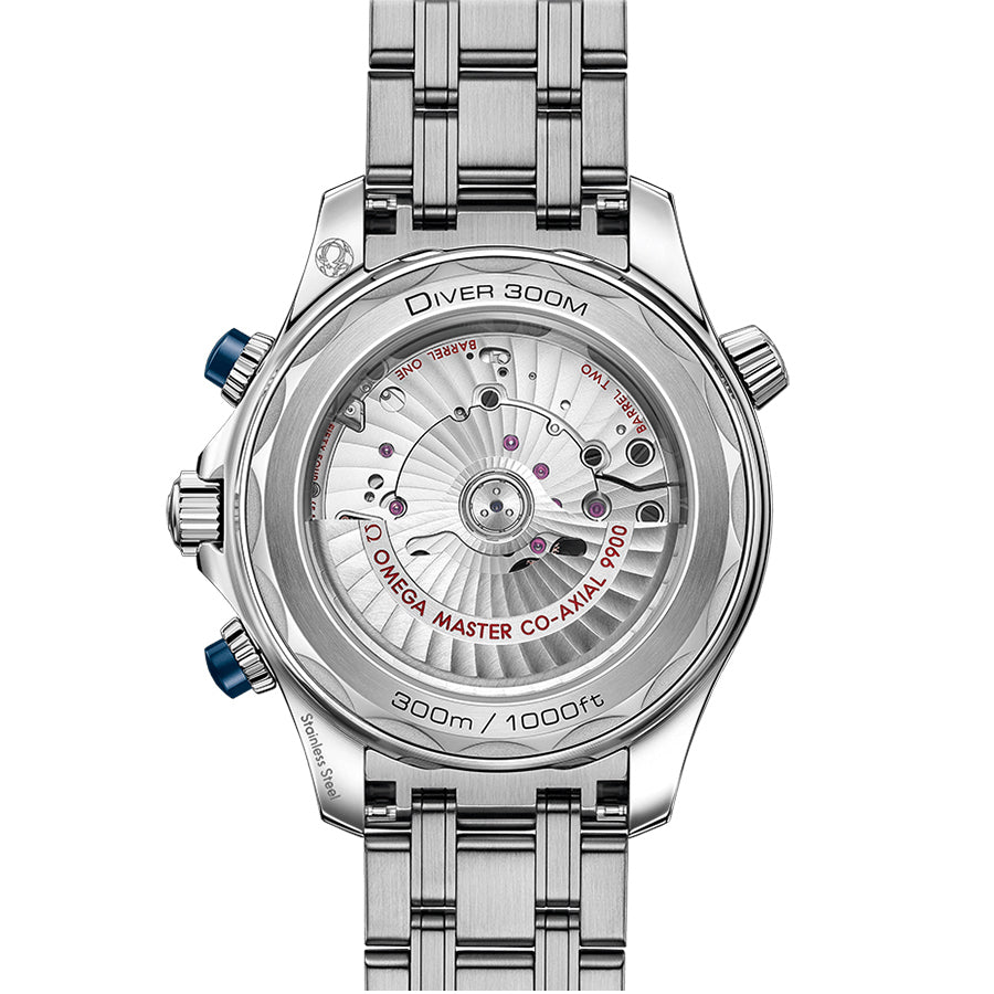 The subdial hands are rhodium-plated, along with all other hands and indexes which are filled with white Super-LumiNova. The watch is presented on a stainless steel bracelet and is driven by the OMEGA Master Chronometer Calibre 9900, which can be seen through the sapphire-crystal on the wave-edged caseback.