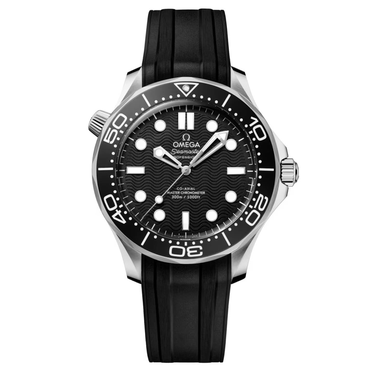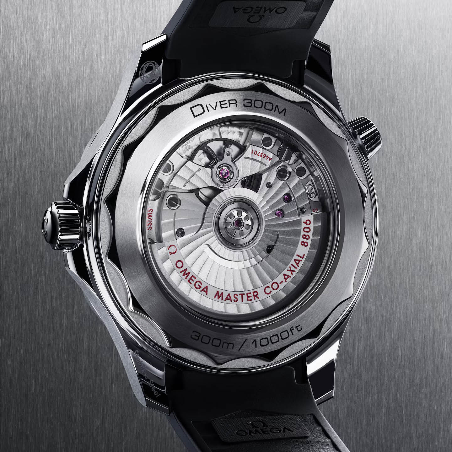The watch is presented on an integrated black rubber strap with foldover clasp, and is driven by the OMEGA Co-Axial Master Chronometer Calibre 8806, which can be seen through the sapphire-crystal caseback.