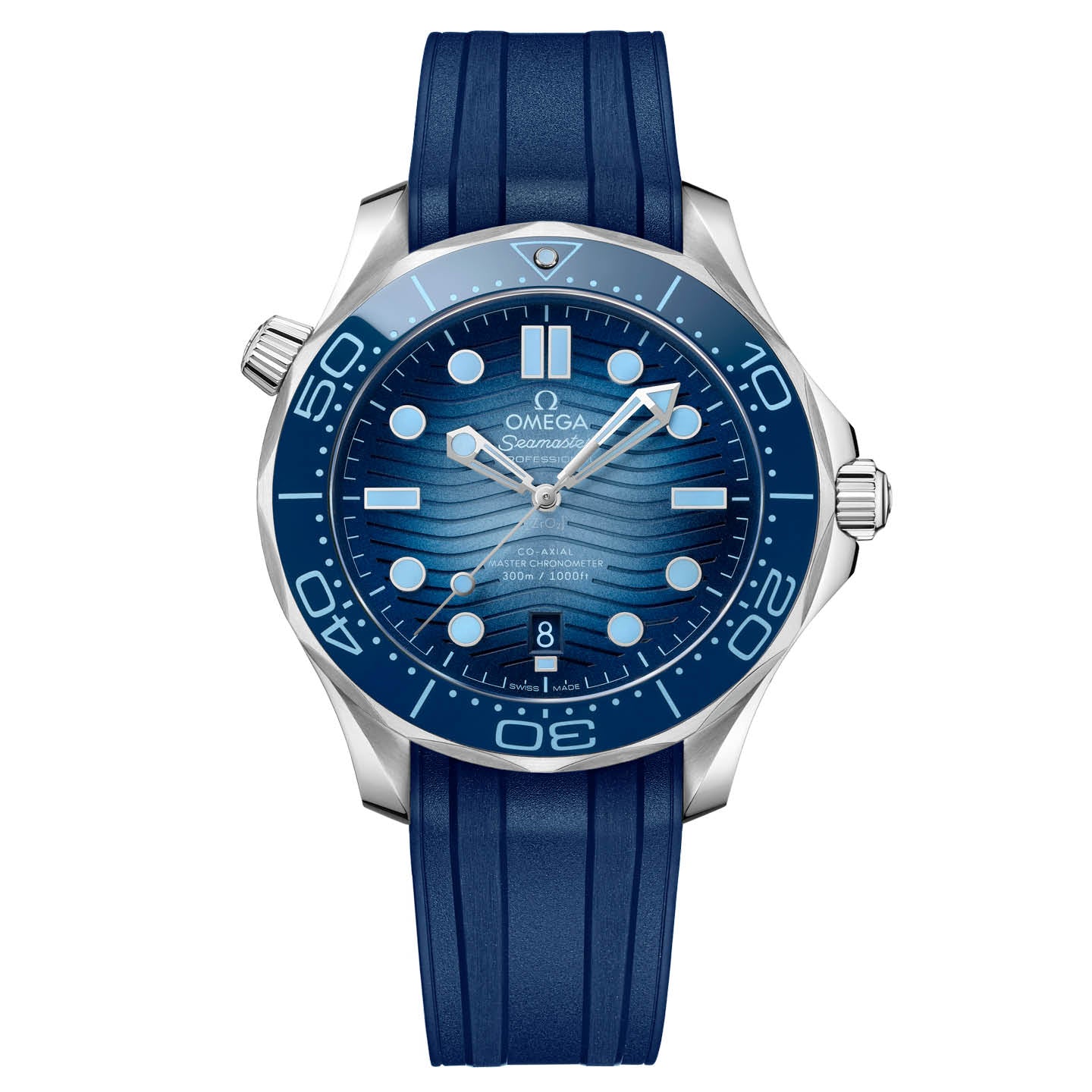 This 42 mm Seamaster Diver 300M, with its case in stainless steel, has a blue rubber strap. The ceramic dial, in OMEGA’s own Summer Blue, is PVD-treated and has a gradient finish to reflect the watch’s level of water resistance. It also includes the 300M’s famous wave pattern.