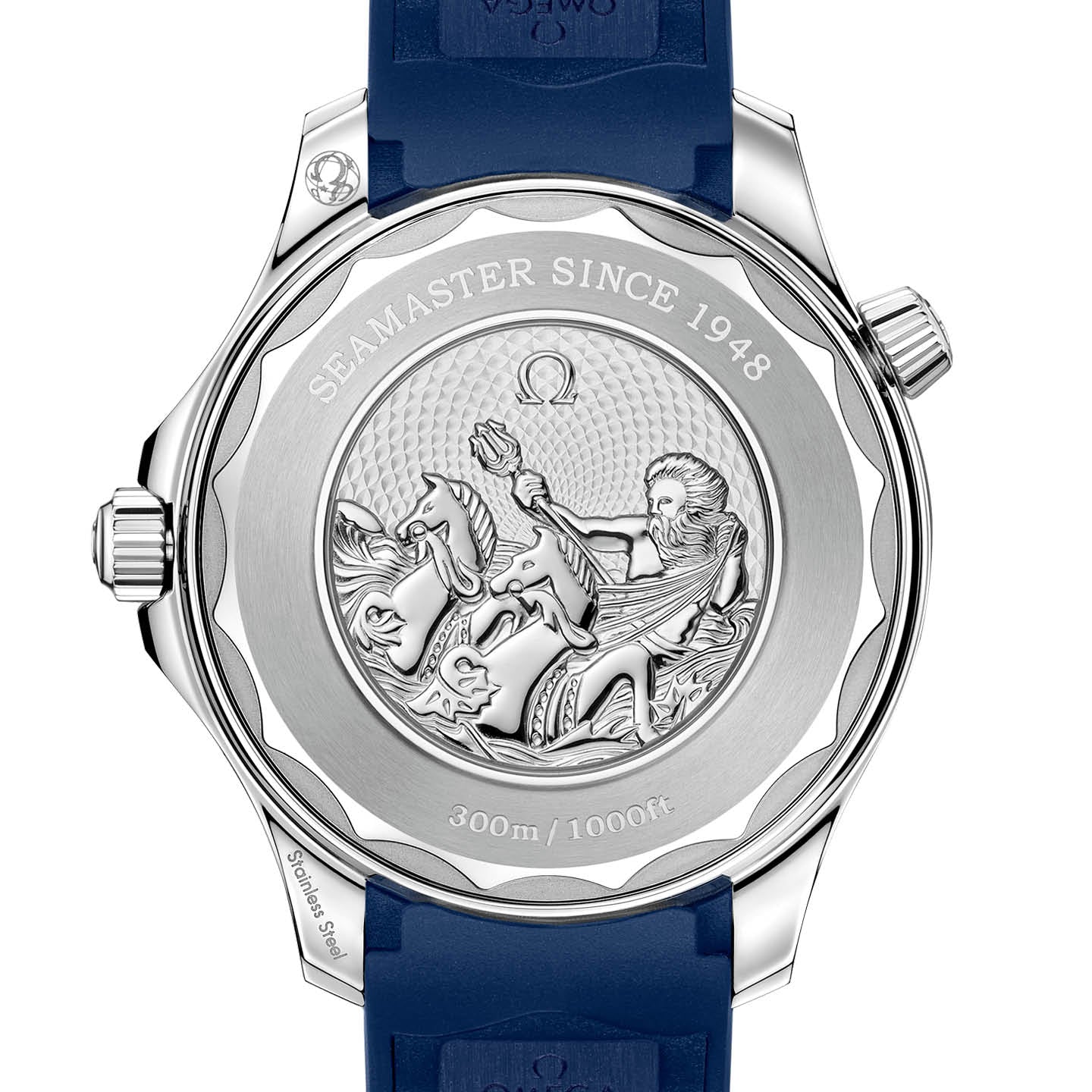 Turning the watch over reveals a stamped commemorative Seamaster logo depicting a trident-bearing Poseidon and two seahorses: OMEGA’s 1956 original and the brand’s current design. Behind which sits OMEGA’s Co-Axial Master Chronometer calibre 8800, certified at the industry’s highest level by the Swiss Federal Institute of Metrology (METAS).