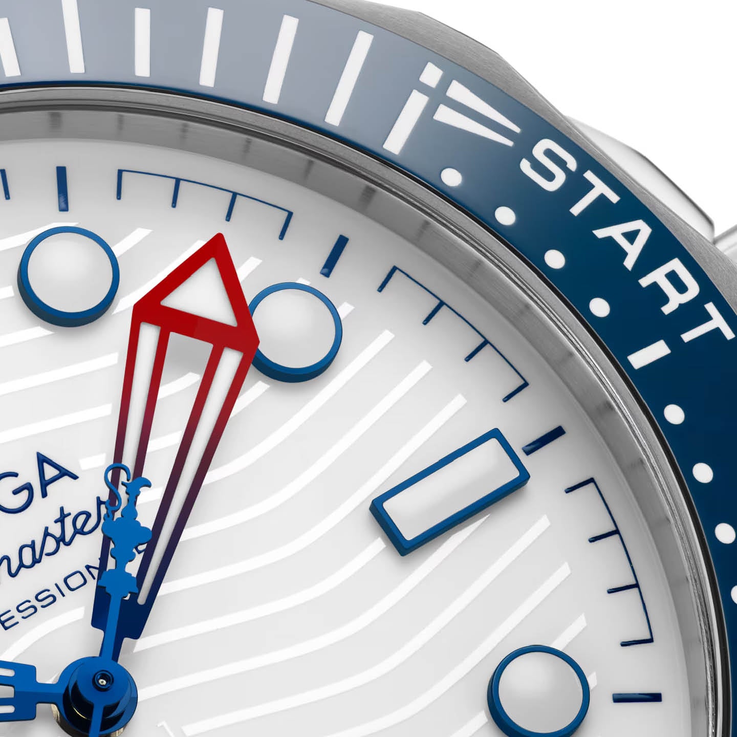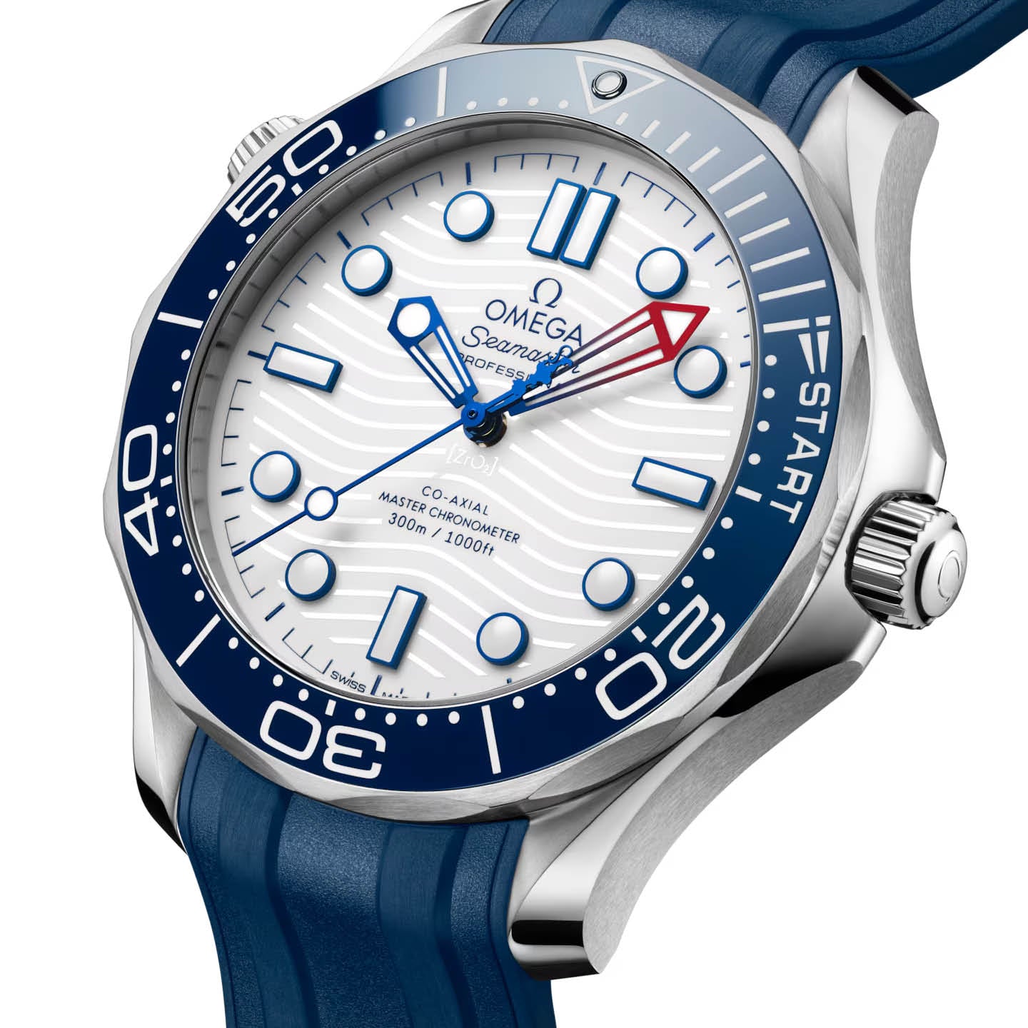 The 42 mm Seamaster Diver 300M in stainless steel has a blue ceramic unidirectional bezel with a regatta scale, comprised of two 5-minute pre-start sections, and START section with regatta-inspired flag.