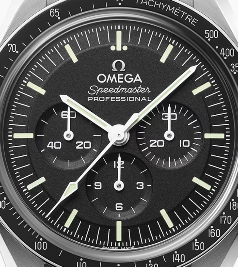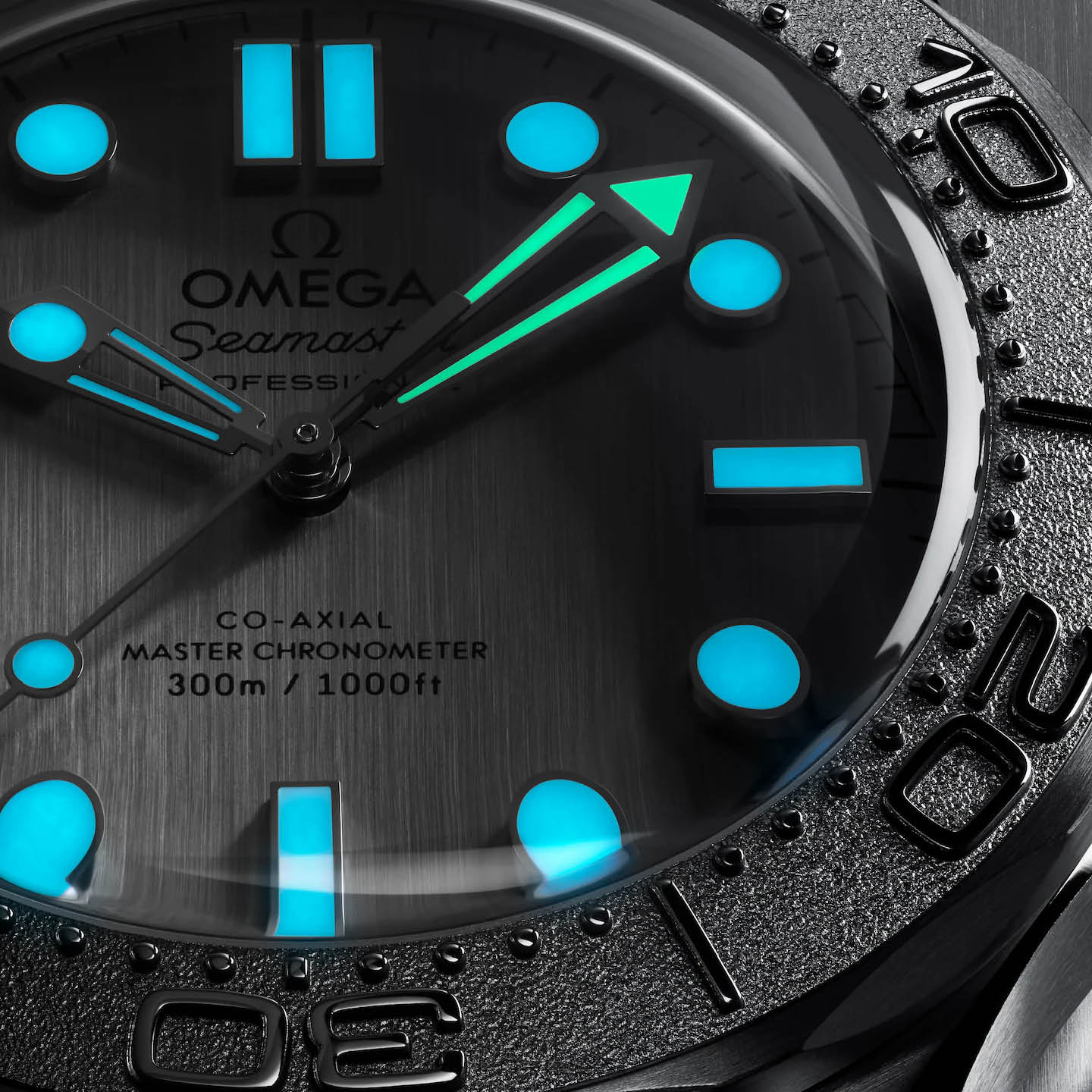 PVD stainless steel is used to create the brushed dial as well as the polished and skeletonized hands and indexes, which are filled with white Super-LumiNova. Other markings, including the OMEGA logo, are transferred in black.