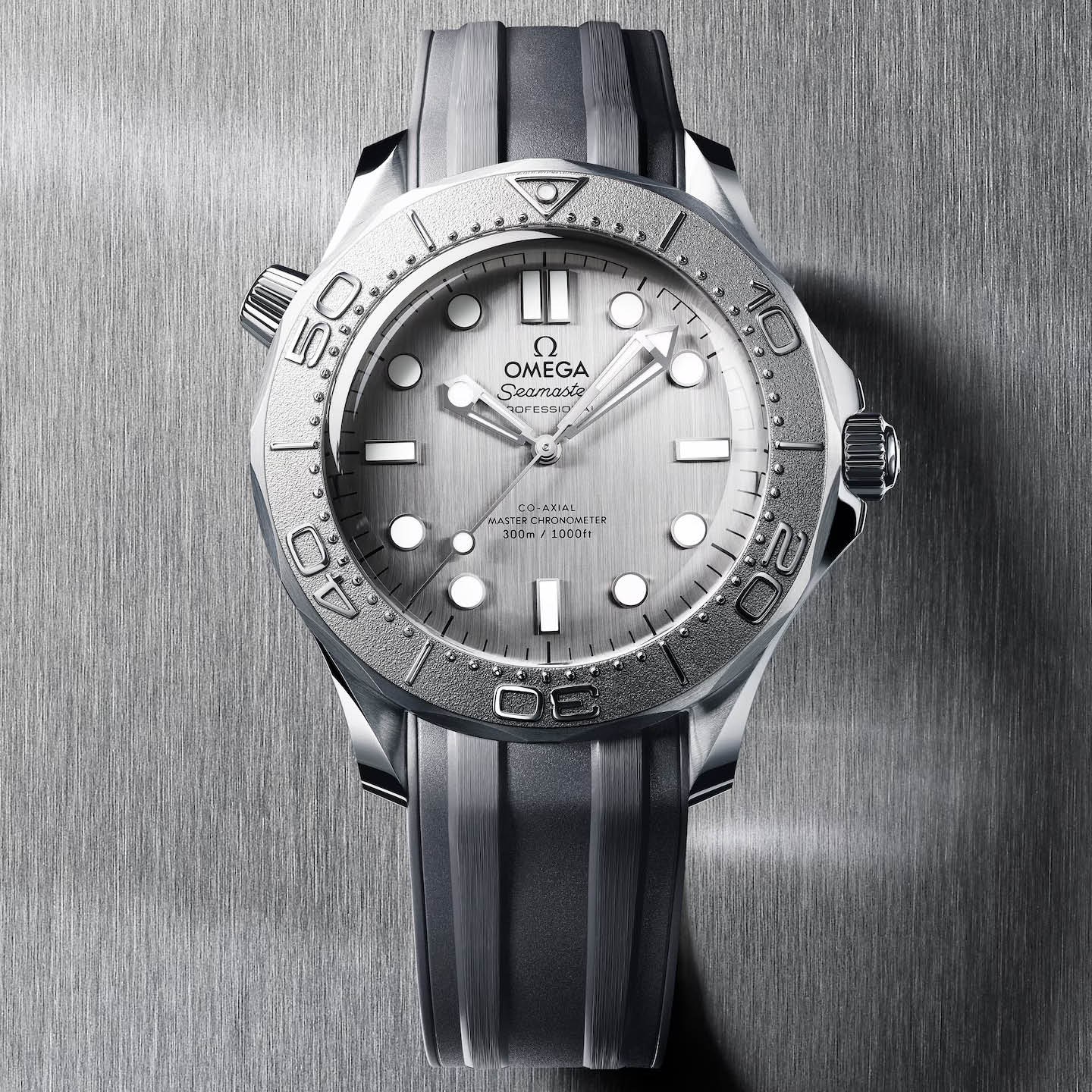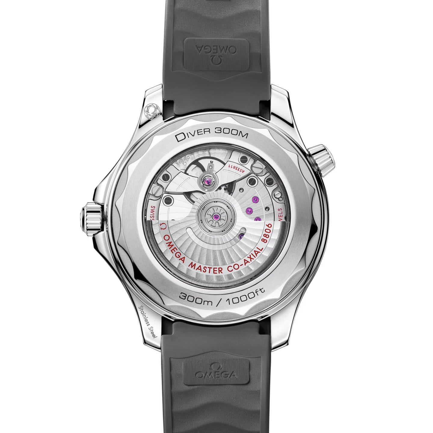 The watch is presented on an integrated grey rubber strap with foldover clasp, and is driven by the OMEGA Co-Axial Master Chronometer Calibre 8806, which can be seen through the sapphire-crystal caseback.