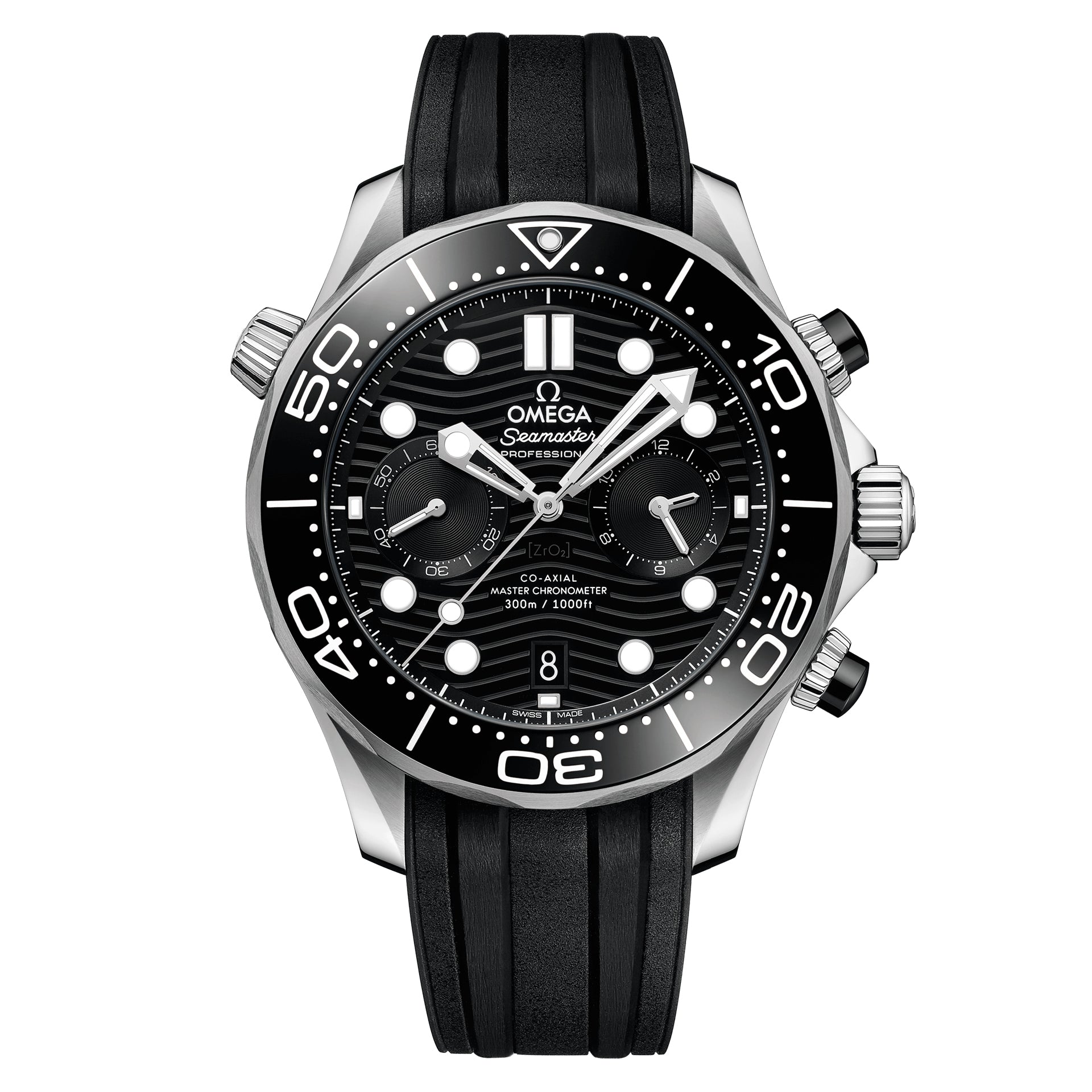 This 44 mm chronograph model is crafted from stainless steel and includes a polished black ceramic bezel with a white enamel diving scale. The pushers are also polished black ceramic, as well as the dial which features laser-engraved waves and a date window at 6 o’clock.
