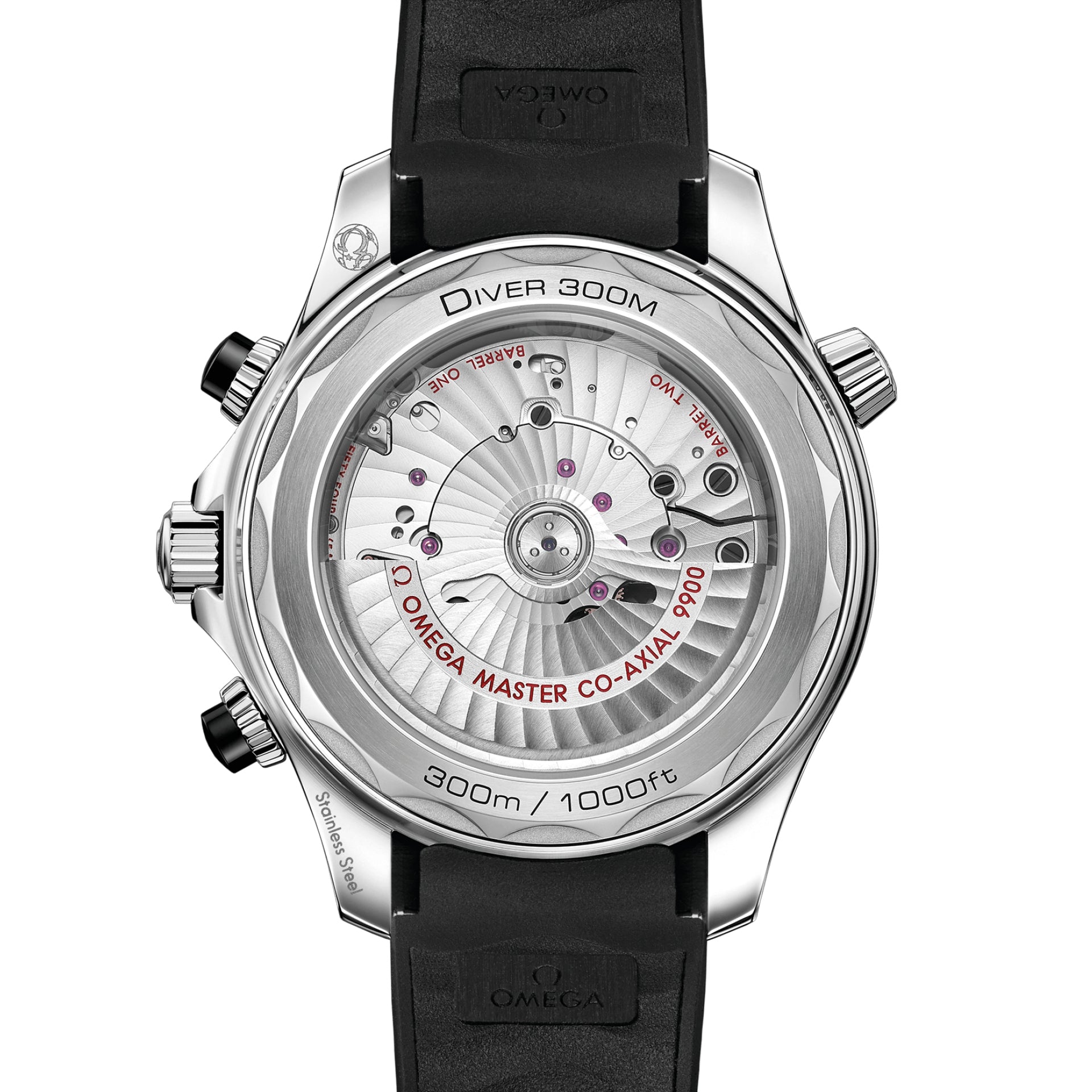 The watch is presented on a black rubber strap and is driven by the OMEGA Master Chronometer Calibre 9900, which can be seen through the sapphire-crystal on the wave-edged caseback.